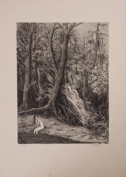 A forest landscape with a nude female figure on the left, sitting knee-deep in a river. The woman has long, flowing hair and holds her palms under her head, which is turned to the left. Behind her is a dense forest, with a large tree at the centre, its roots prominently depicted.