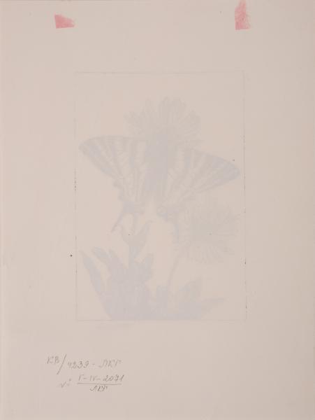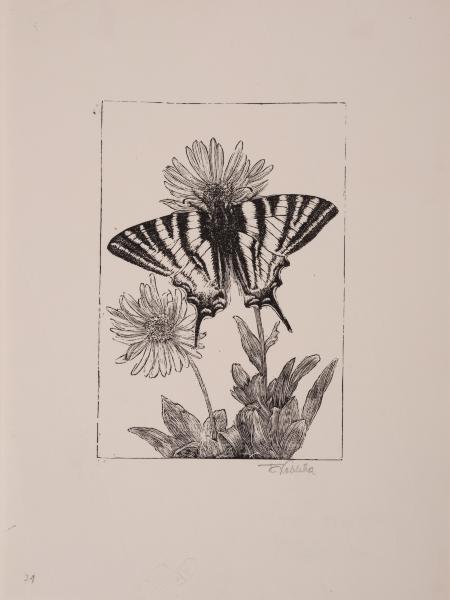 The work shows a decorative motif designed for book embellishment. The butterfly was a popular image in Art Nouveau culture. Two blooming daisies are depicted on the white background of the engraving. The right daisy is taller than the left one. At the bottom of both flower stems, there are elongated leaves. A butterfly with open wings is perched on the right daisy, covering its lower part. Identical black-and-white stripes run across the left and right wings of the butterfly. At the bottom of both wings, there are four wavy protrusions. There are legs and antennae on the front of the butterfly’s body.