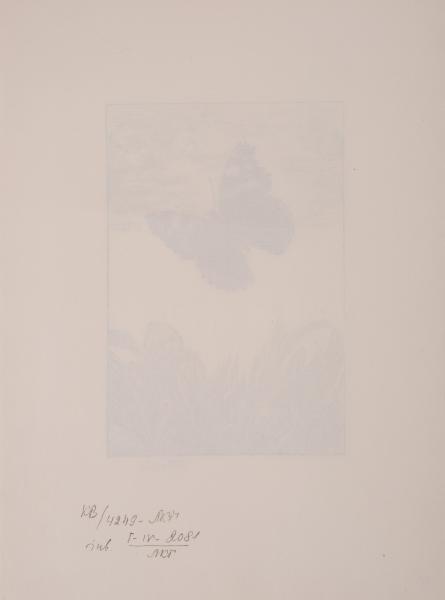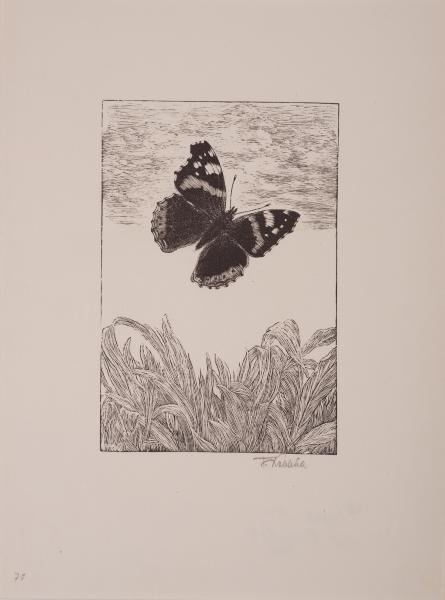 The butterfly is one of the favourite themes in Art Nouveau. It is often associated with the soul or the fleeting nature of life. Frantisek Kobliha frequently used this motif to decorate books. In the centre of the engraving, against a backdrop of clouds, a butterfly is depicted in flight with its open wings. The surface of the wings is dark, while the edges are patterned with light colours and black spots. On the upper wings, there are arched light stripes. At the bottom of the engraving, wide grass stems are depicted swaying in the wind.