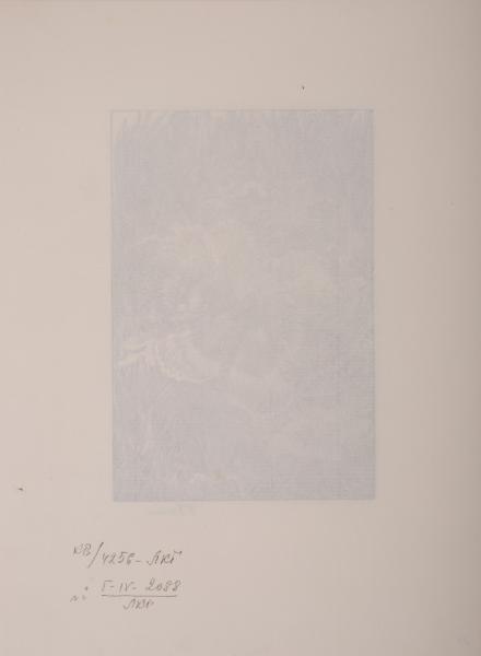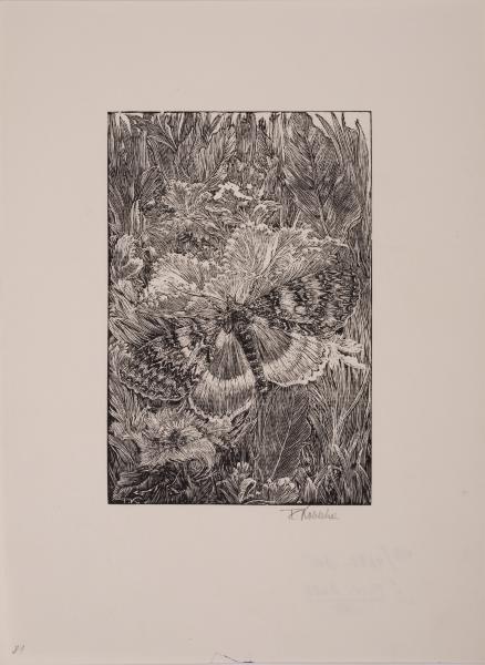 The work is a decorative floral composition featuring a butterfly. It was likely intended for book embellishment. Against the backdrop of luxurious broad-leaved plants and flowers that fill the entire surface of the image, a large butterfly with open wings is perched. The upper wings have zigzagged thin transverse stripes. The lower wings are smooth grey, becoming lighter toward the bottom.