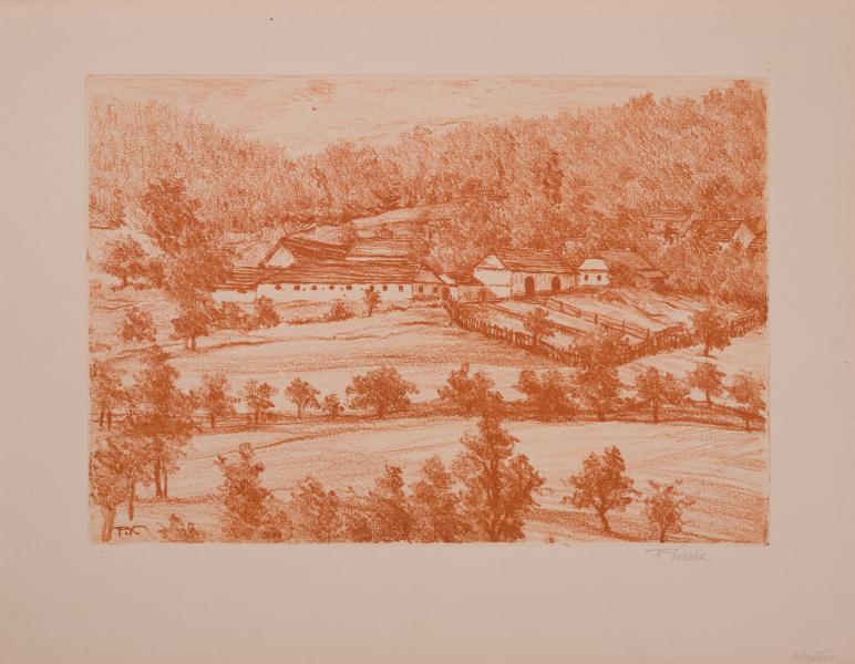 The work shows a rural landscape executed in a realistic style. The engraving depicts a village located on hills covered with trees. In the foreground is an open meadow surrounded by trees. Above are peasant houses with outbuildings, surrounded by dense greenery of trees and shrubs. Two houses on the right are depicted with garden plots enclosed by a picket fence. In the background are a thick strip of forest and a fragment of a cloudy sky.