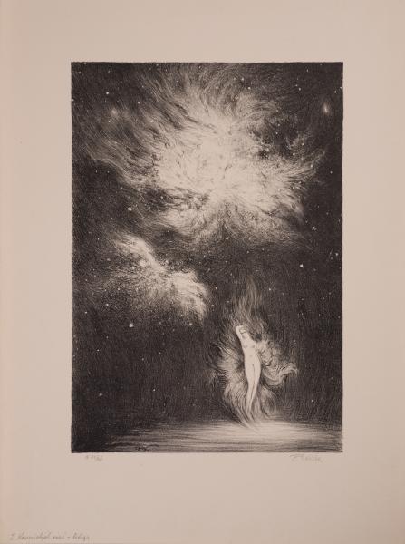 The work depicts a cosmic fantastical landscape. A nude female figure is shown against a dark, starry sky with clusters of swirling clouds resembling fantastical birds. Flames surround the female figure.