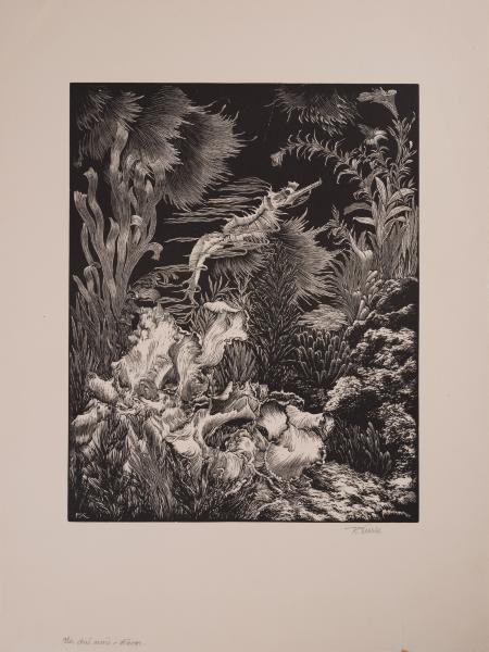 The work shows a seafloor landscape. Various seaweeds are depicted on the bottom of the sea. On the lower left are broad, lobed leaves, while to the right are clusters of stick-like marine plants, behind which is a large accumulation of stone boulders. In the upper part, against a black background, a fantastical fish (possibly a seahorse) with many thin, wavy fins swims upward to the right. To the left of it is a bush of wavy leaves, and in the right corner, the leaves resemble sedge and horsetail. Broad leaves are swaying in the water at the top, on the left and right. The depiction of an underwater fantastical world was popular in the Art Nouveau and Secession movements.