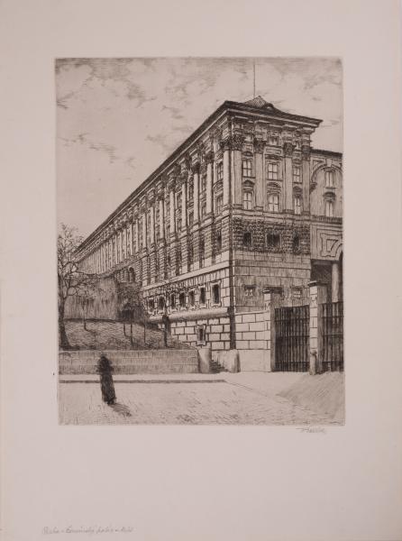 The work is an urban landscape depicting Czernin Palace, constructed in the early Baroque style. The palace is a landmark architectural monument of the city. In the foreground of the engraving, there is a square where a woman in a long dark attire is walking, depicted from behind. In front of her, to the left, is a small garden, with stairs leading to it on the right. To the right, behind the gates, rises the monumental structure of Czernin Palace. The palace has five floors and is depicted at an angle to the viewer. The second floor is adorned with rustication, and between the windows of the third and fourth floors are semi-columns of the Tuscan order.
