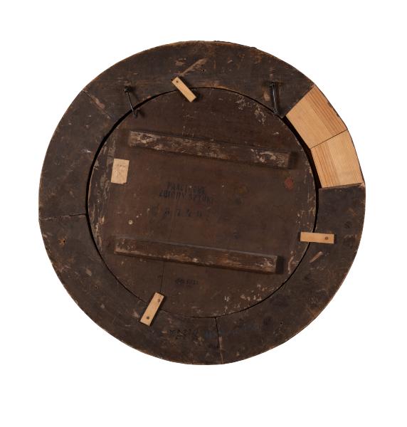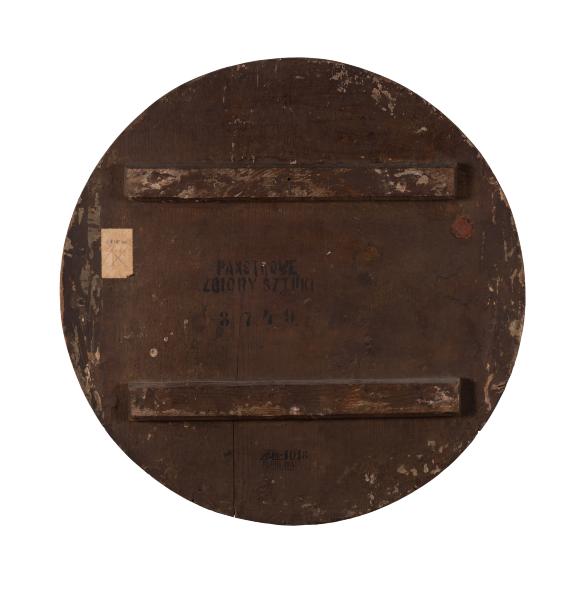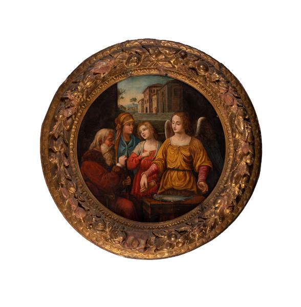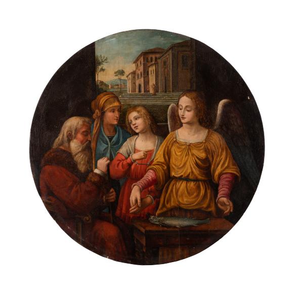 A scene from the life of Tobiah, a biblical character from the Book of Tobit, unfolds against the backdrop of a cityscape. It depicts an episode when Tobiah, with the help of Archangel Raphael, cures his father of blindness. Tobit, the father of Tobiah, whose name in Hebrew means "God is good", is the main character of the eponymous deuterocanonical book of the Old Testament, an Israelite from the tribe of Naphtali. He was righteous and devout, yet for his good deeds, he faced persecution from the Assyrian government and endured a series of trials, including blindness. The Archangel Raphael, while helping Tobiah, instructed him to catch a fish in the Tigris River and said: "Apply the fish gall to his eyes, and the medicine will make the white scales shrink and peel off from his eyes; then your father will have sight again and will see the light of day" (Tobit 11:8). The artwork depicts an archangel holding Tobiah by the hand while gazing at a fish. Tobiah, in turn, is pointing at Raphael. The elderly Tobit, Tobiah's father, is seated, leaning on a staff. Next to him is his wife, Anna, who is gazing at the Archangel Raphael with admiration.