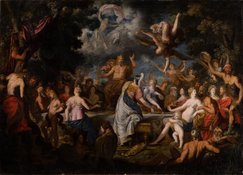The iconography of this theme is typical in European art because it allows for the simultaneous depiction of all the Olympic gods. The nymph Thetis is the daughter of the famous centaur and sage Chiron, the tutor of heroes and gods, while Peleus is the son of Zeus, king of Iolcus. Zeus personally marries Thetis, whom he pursued until he received a prophecy that her son would be stronger than his father. Later, Thetis will give birth to Achilles by Peleus. The painting features (from left to right): Apollo, Marsyas, Paris, Diana, Peleus, Thetis, Zeus, Athena, Hera, Hermes, Poseidon, Amphitrite, Aphrodite, Cupid, Hephaestus, Dionysus, the Erinyes, Helios, and sphinxes. Eris, the goddess of discord, was the only goddess not invited to the wedding. The offended goddess appears uninvited at the banquet and throws a golden apple onto the table with the provocative inscription "To the most beautiful!". The artist depicted this exact moment. A dispute arises between the goddesses Hera, Athena, and Aphrodite over who should rightfully claim the apple. Zeus assigns the task of resolving the matter to the Trojan prince Paris (a story known as "The Judgement of Paris"). As a result of his decision in favour of Aphrodite, who promised him the love of the most beautiful mortal woman – Helen, who was already the wife of King Menelaus at the time – the Trojan War began, leading to the fall of Troy.