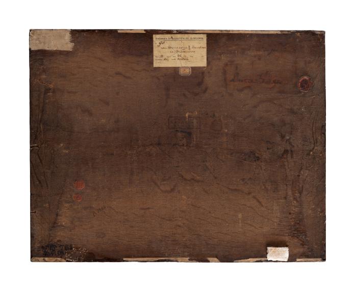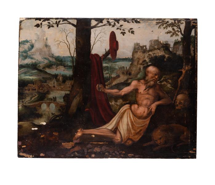 Saint Jerome was a scholar and hermit of the 4th century who created the standard Latin translation of the Bible, known as the Vulgate. The saint is depicted kneeling in repentance in the desert, where he spent four years in solitude. As a reminder of death, a human skull lies at the foot of the crucifixion. Beside him is depicted a tame lion, from whose paw the saint has removed a thorn. The artist evokes particular admiration with his depictions of the landscape in the background.