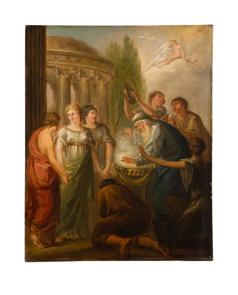 In the painting, the scene of Psyche's engagement is depicted against the backdrop of a rotunda. In the center of the work are the altar and the oracle. On the left, Psyche is surrounded by her two sisters. The artist depicted a mythological scene, specifically the moment when Psyche's father consulted the Miletus oracle to avert Aphrodite's displeasure towards her. By the oracle's decree, Psyche was taken to a cliff for her marriage to a terrible beast. Suddenly, a breath of wind transported her to a magnificent palace, where she became the wife of a mysterious creature who visited her only at night and promised never to question his identity. The jealous sisters, having learned of Psyche's happiness, resolved to destroy her, deceived her, and succeeded in making her break her promise. They told their sister that her husband was a beast and convinced her to wait for him to sleep, armed with a sword and a lantern, so she could kill him. Waiting for nightfall, Psyche lit the lantern and began to examine her husband, who turned out to be the beautiful Eros. The artist, in the spirit of romanticism, depicts this touching episode of the myth, portraying the characters in dynamic tension. As a portraitist and landscape painter, Schutz meticulously delineates the facial features and details of the painting in a vibrant, rich color palette.