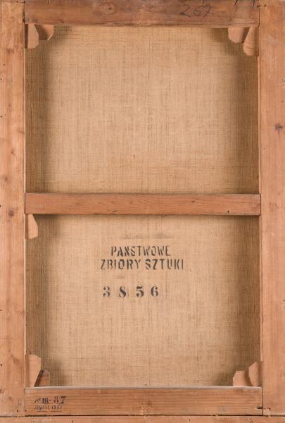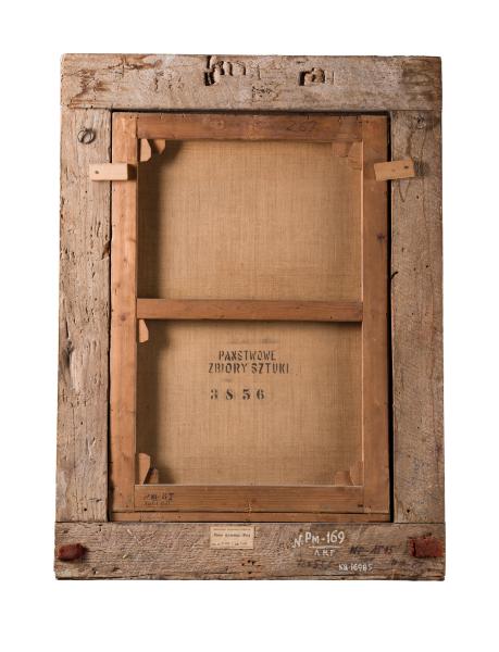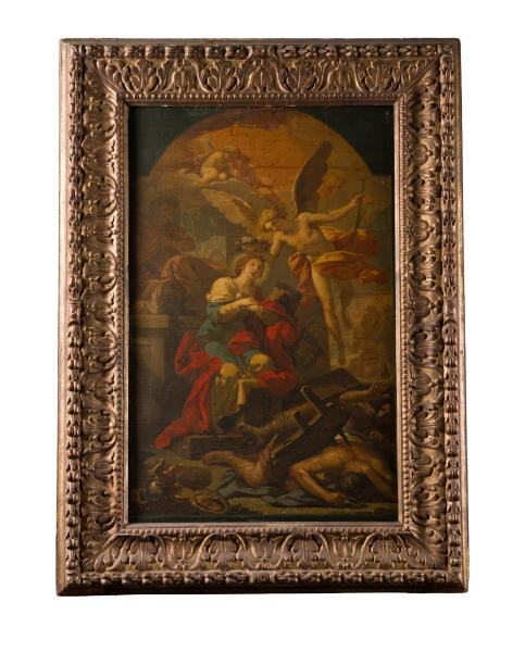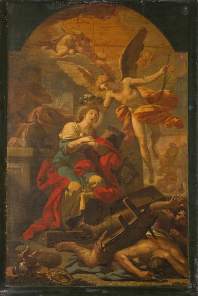 On the stone steps, covered with red fabric, sits a woman with her arms folded across her chest. Her torso is slightly turned to the right, and her head is bowed. The woman is dressed in a long white blouse and wears a knee-length green dress. An angel hovering in the air gently places a wreath of pink and white flowers on the woman's head with his right hand while holding a palm branch in his left hand. Above, angels are depicted on a cloud. To the left of the woman, on a pedestal, is the figure of a man in prayer, depicted with symbols of authority. At the feet of the woman on the ground are the figures of two men crushed beneath the fragments of a broken wheel. Saint Catherine of Alexandria is a Christian saint who was martyred for her faith by Emperor Maximinus. The angels shattered the execution wheel on which the saint was supposed to be tortured. Then, the executioners beheaded Catherine. Saint Catherine was depicted by Raphael Santi, Caravaggio, Lucas Cranach, Guido Reni, Barbara Longhi, Paolo Veronese, Anthony van Dyck, and others.