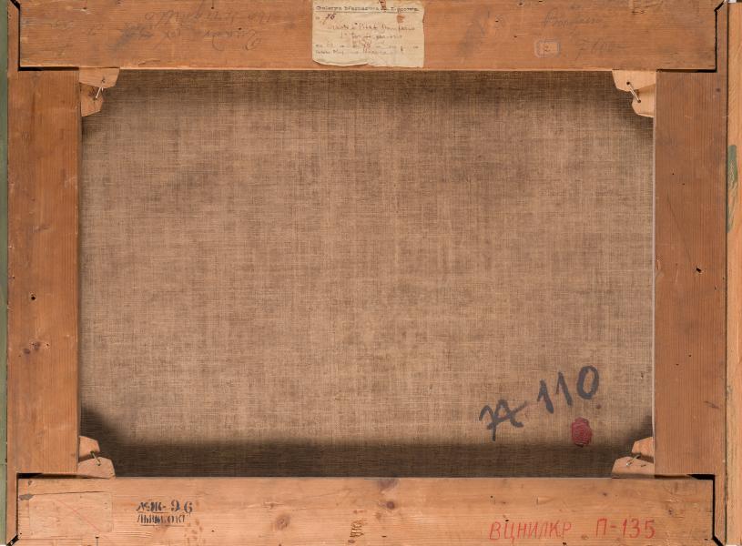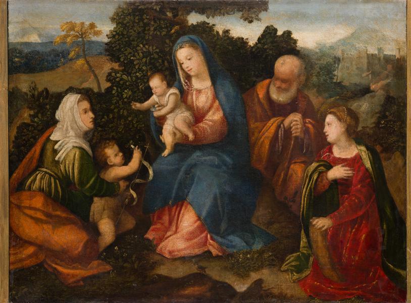 The work belongs to the type of composition known as "Holy Conversation", where the artist skilfully replicates the genre's technique, developed in Italian painting during the Renaissance, depicting the Virgin Mary with the infant Jesus among a group of saints. The composition of the Sacra Conversazione is structured so that all the leading figures are on the same level, which is why the work is in a horizontal format. The Virgin Mary with the infant Jesus sits in the centre, while on the left are Saint John the Baptist and Saint Elizabeth. The gestures and gazes of all are directed towards Jesus, indicating adoration. John the Baptist extends a cross with a ribbon bearing the inscription "Ecce Agnus Dei" ("Behold the Lamb of God") towards the Child, serving as a reminder to the viewer of His redemptive sacrifice. Such works were often commissioned for private chapels or prayer rooms. The choice of depicted saints is dictated by the patrons of the commissioner and their family, as well as the patrons of the church or city.