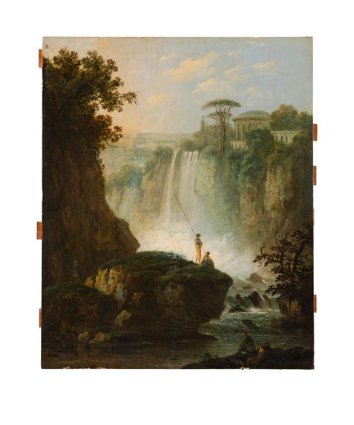 Jakob Philipp Hackert became one of the best landscape painters at the Neapolitan court by depicting Italian landscapes. In the 16th century, depictions of villas on the outskirts of Rome became popular. Particularly often depicted was the Villa d'Este in Tivoli, where the natural landscape of the waterfall harmoniously coexists with the architecture. The painting "Waterfall in Tivoli" depicts a landscape featuring a large waterfall, next to which stands an ancient rotunda. The artist accurately reproduced the landscape in a topographical manner. The meticulous detailing, along with the influence of the veduta genre and Dutch painting, crystallised the subdued colour palette of the landscape, characteristic of the artist.