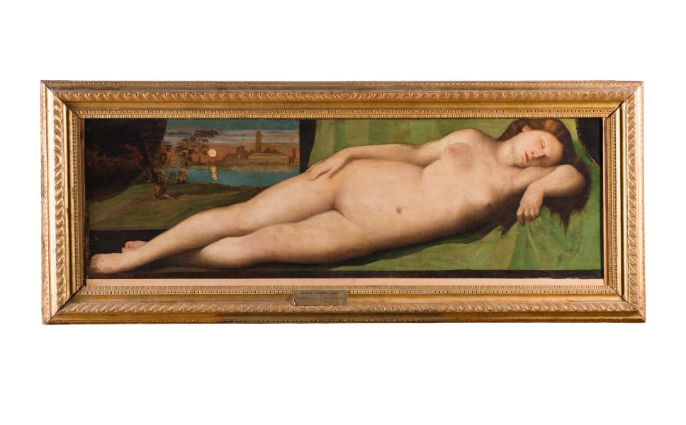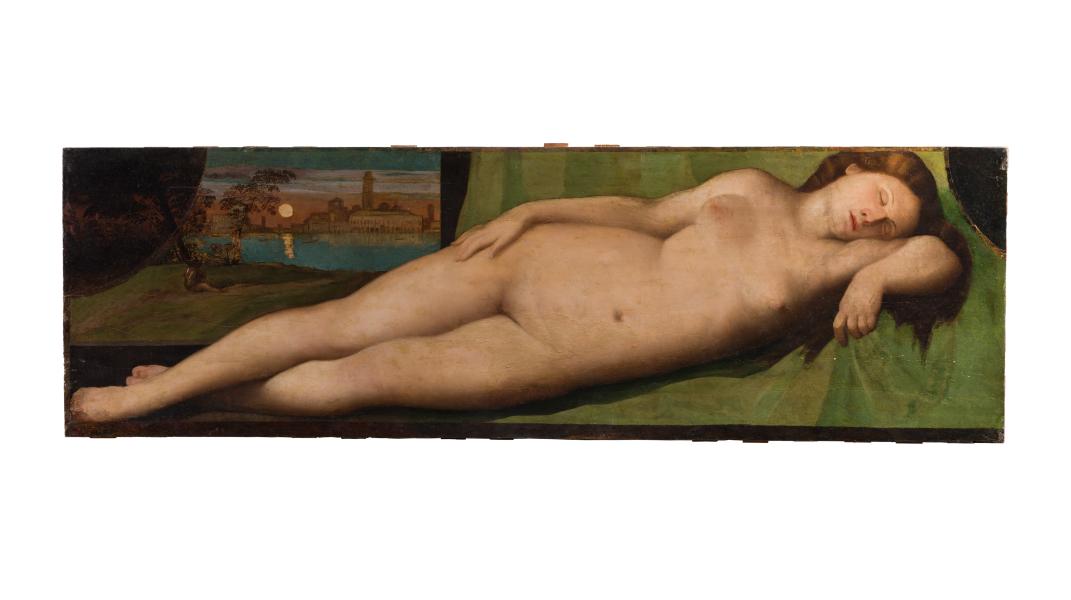 A sleeping nude woman is depicted on a bed covered with light green fabric in a warm shade. To the left, behind a pulled-back dark curtain, a landscape breathes with tranquil beauty. The sun sets behind the outlines of an ancient city, its long reflection touching the water's surface. The artwork exudes a particular charm. The refined fluidity of lines, soft outlines of the distant landscape, and the use of shadows to create volume – all of these are characteristic of the works of Renaissance artists. The reference to ancient mythology is a distinctive feature of the Early Renaissance period. Ancient culture became the foundation and arsenal of humanism, which celebrated humankind's spiritual and physical beauty. "Sleeping Venus" was one of the most popular themes of that period. Venus is the goddess of beauty, love, spring, desires, and rebirth.