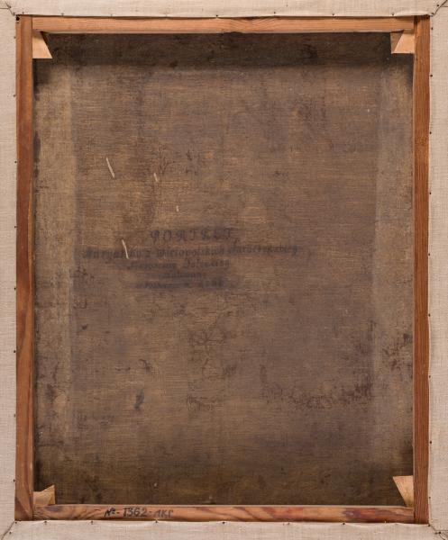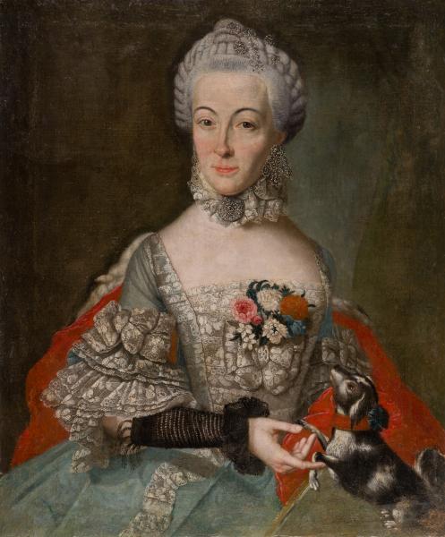 The painting depicts a woman in a gentle turn, gazing at the viewer. She is portrayed in an elaborate dress typical of 18th-century fashion, adorned with flowers. With her right hand, she supports a Papillon dog – one of the oldest toy spaniel breeds. According to research by I. Khomyn, the portrait depicts Maria (Marianna) Jaroczewska, the daughter of Karol Wielopolski, the Grand Crown Standard-Bearer, and Elzbieta, originally from Mniszech. Marianna was likely born after 1725. In 1759, she became the wife of Tadeusz Jarochewski, the starost of Solec and a councillor of the Bar Confederation. On the reverse of the painting, there is an inscription indicating to whom the portrait belongs, along with the year the work was created – 1768, and the location – Poznan.