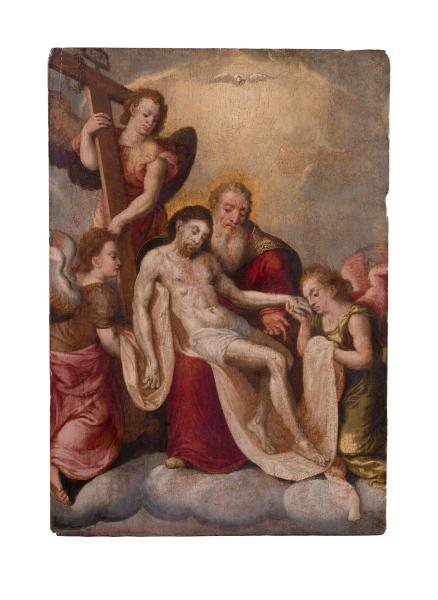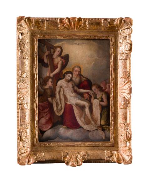 The painting depicts God the Father holding His Son Jesus, with the Holy Spirit above them in the form of a dove. Thus, the image portrays the entire Holy Trinity. On the left, above the dead body of Jesus, two angels hold the cross on which His body had hung until just moments ago. Only a crown of thorns and the inscription "INRI" ("Jesus of Nazareth, King of the Jews") hang from the cross. On the right, an angel kneels in adoration of the dead body, paying homage. The depiction of God the Father supporting his crucified Son in the composition "Lamentation" dates back to the fifteenth century, although it is quite rare. The painting represents the mysteries of Redemption and the sacrificial, great love of God for Humanity. "I am the resurrection and the life. The one who believes in me will live, even though they die. And whoever lives by believing in me will never die" (John 11:25-26).
