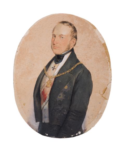 The work shows a half-length image of a middle-aged man with his gaze directed at the viewer. He is depicted with wide sideburns, wavy hair combed to the side, and medals around his neck and chest. The man is dressed in a black tailcoat, with a white ribbon visible across his left shoulder. He is wearing a white vest and a collar tied with a bow tie. On his chest is a gold chain with an eagle. Agenor Goluchowski (1812–1875) was an Austrian statesman, political figure, and count. He served as the Governor of Galicia (1849–1859, 1866–1867, 1871–1875) and the Minister of the Interior of Austria (1859–1860).