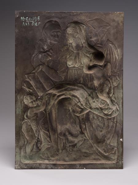 A foreground figurative composition, with the Mother of God seated on a high podium in the centre, resting a book on her knee. The Madonna's legs and the podium are completely covered by wide draperies of clothing. Her head, covered with a hooded cloak, is turned to the right towards an older woman (Anna). Anna, dressed in a cloak with a hood, has placed her right hand on her daughter's shoulder and, clutching a staff in her left hand, is leaning forward and talking to her daughter. A small, naked boy (Jesus) is pressed against his mother's chest on the left, and she is holding him from behind. Young John the Baptist is leaning against the Madonna's knees on the right. At the top left is a profile image of an older man (Joachim) wearing a headdress reminiscent of a medieval Flemish chaperon. The manner of execution – the representation of a New Testament scene in the context of genre art – allows the work to be attributed to the heritage of the Northern Renaissance masters.