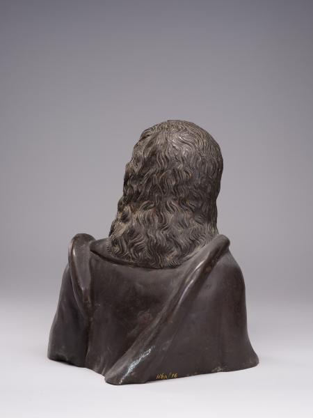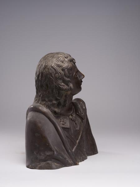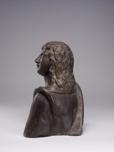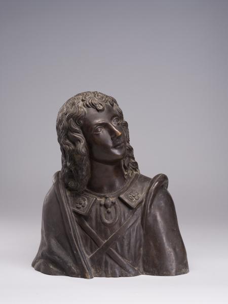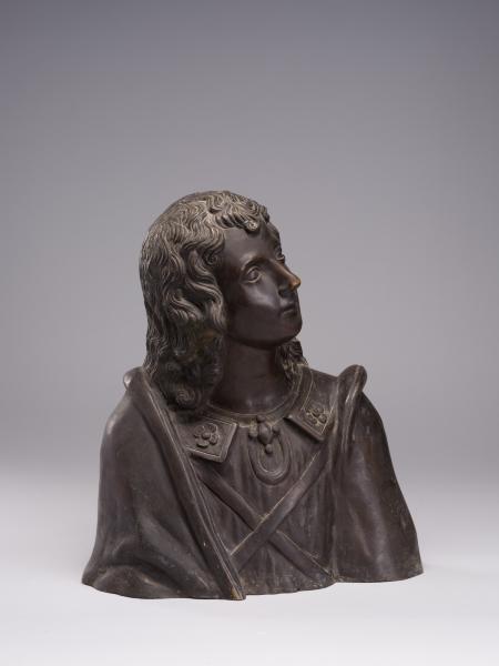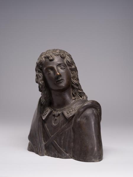 A bust sculpture portrait of a young Northern Italian nobleman (aristocrat). The man’s head with long wavy hair and a youthful, surprised face is turned upward to the right. He is depicted wearing a blouse crossed with ribbons on the chest, a collar decorated with rosettes, and a pelerine on the right shoulder. On the left shoulder of the young man is a rounded profile. This sculpture represents the work of a highly skilled master of the early Renaissance.