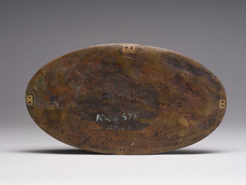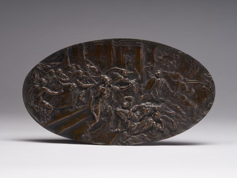 The work belongs to a series of eight mythology themed oval plaquettes by Guglielmo della Porta. In Greek mythology, the hero Perseus was known for slaying Medusa, a gorgon with snake hair whose grotesque appearance turned people to stone. The relief depicts a later episode in the hero's life. The wedding of Perseus and Andromeda was interrupted by a warlike crowd led by Phineus, a disappointed suitor. After a fierce battle, Perseus finally won, turning his opponents to stone with Medusa's head. The artwork is a dynamic multi-figure composition with Perseus in the centre – a warrior in a helmet with a sword in his right hand lowered to the ground and Medusa’s head in his outstretched left hand. On the right are the bodies of enemies killed by the monster's gaze. In the background, against the backdrop of an architectural arch, the battle between Perseus' companions and Phineus' warriors continues. On the left, at the table, sits Andromeda's father, King Cepheus of Ethiopia, in whose palace the wedding is taking place, and to his right is his wife, Cassiopeia.
