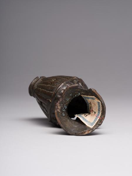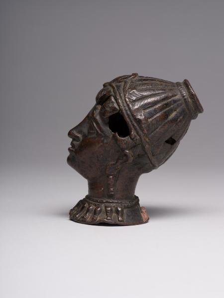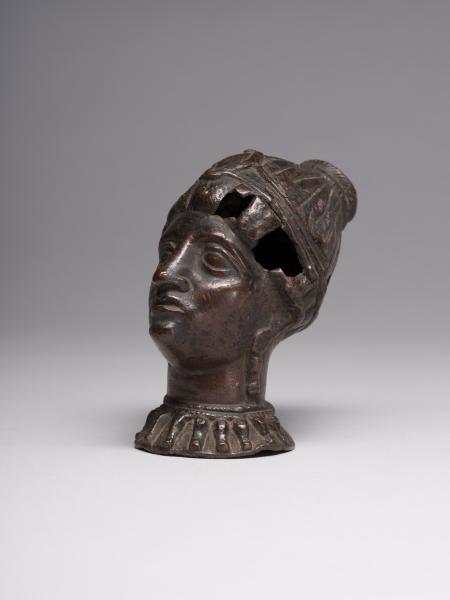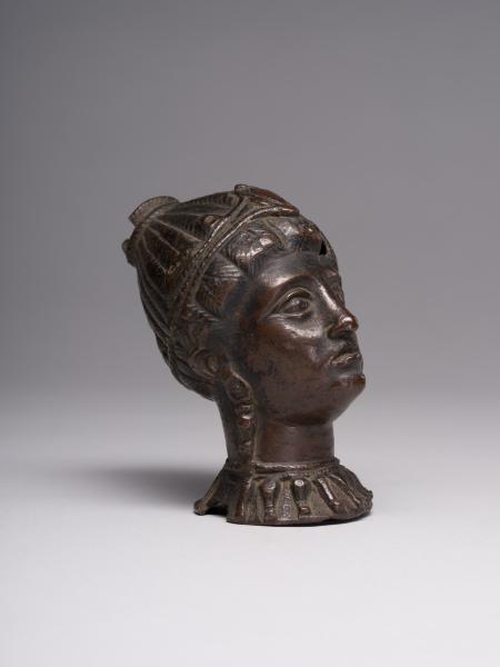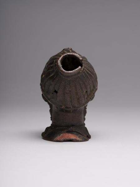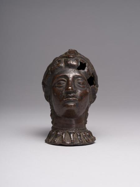 The origin and dating of the work can be assumed based on the analysis of the person depicted. It could be Asia Minor, the Middle East, or Ancient Greece. The archaic nature of the work indicates the middle of the first millennium B.C. The piece of decorative and applied art is possibly a jewellery box found during archaeological excavations. Losses of fragments of the work indicate that the object was not in use for a long time and was obviously lying in the ground. The work depicts the head of a noble lady with eastern facial features (plump lips, large almond-shaped eyes), with a necklace around her neck and a tiara that fixes a high, combed-back hairdo above her forehead. At the top, the hairstyle forms an opening, and the woman's long earrings, tiara, and necklace suggest that these were the kinds of feminine jewellery that were stacked inward through this circular opening. The first of the work's known owners, Vladyslav Lozynskyi, noted its archaic classical features.