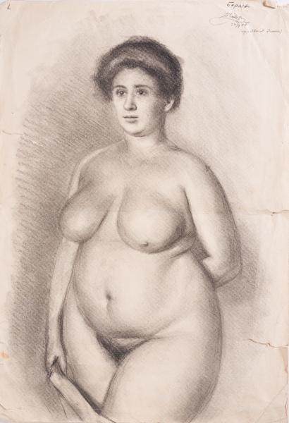 The graphic sheet depicts a knee-length female figure in a frontal position with a slight turn of the torso and head. The model's left hand is behind her back, and in her right hand, she holds an unidentified, elongated object with a textured surface (similar to paper or fabric). It is important to note that this pose is quite common in classical academic compositions, as the peculiarities of angles, lighting, and plastic features are important for studying the plastic features of the human body, its anatomical structure, and the reproduction of complex three-dimensional objects on a two-dimensional plane. The interpretation of the face is probably portrait-like, but quite stereotypical, which is also typical for educational productions when the teacher focuses on the analytical study of the model's body. It should be emphasized that, despite the softness of his approach to interpreting the human body, the author does not idealize it, but consistently reproduces the features that make it recognizable – from the massiveness of the torso and hips to the size of the mammary glands and the asymmetry of the hair on the pubic mound. The nature of the work indicates that this is an academic study of a nude female model, executed in a studio, rather than a copy from a photograph. This can be confirmed by the author's approach to reproducing the figure, particularly in the construction of perspective. It should be noted that the source of lighting is clearly visible in the work, allowing the three-dimensionality of the volume to be demonstrated in a classical manner. The shadows are quite soft, and the tonal transitions are correctly applied, revealing the plasticity of the naked human body. The work with strokes is balanced and professional, indicating the author's serious prior practical experience. In the left part of the composition, the author uses strokes to shade the background and highlight the human figure on the sheet of paper. Given the stylistic solution of the composition and the peculiarities of the hatching technique used, the work is a fairly ordinary example of a training studio from the European academic school of the late 19th to the first third of the 20th century. It should be noted that while the artistic value of this work is debatable, its historical significance is undeniable, particularly in the context of analyzing the work of artist Yulian Zaiats and researching his professional development. Thus, in this work, one can clearly see how committed the author was to the learning process and how he sought to solve complex tasks from an analytical perspective, rather than being satisfied with purely visual effects and techniques.