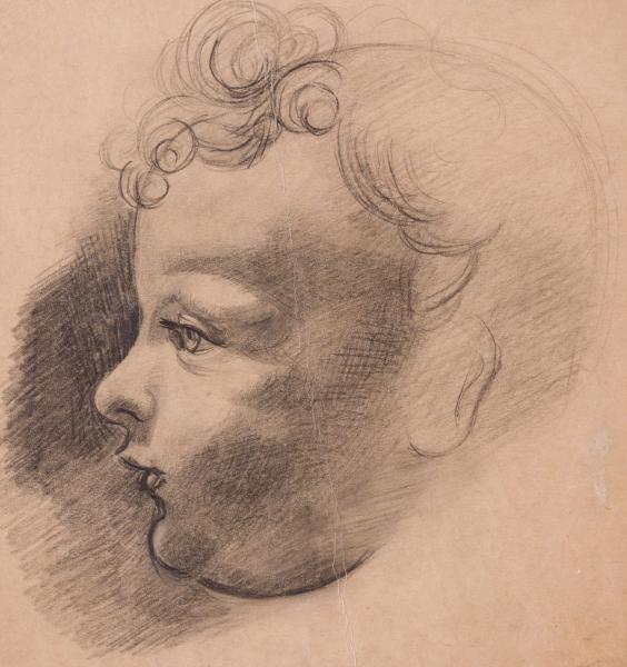 A sketch of the head of the young Jesus, where he blesses the young John in the painting "Madonna in the Grotto". Unlike the original work, Christ's head is depicted in a straight profile, rather than slightly raised as in the painting. The author draws the child's face in detail against a dark background, while only schematically depicting the child's wavy hair and ear.