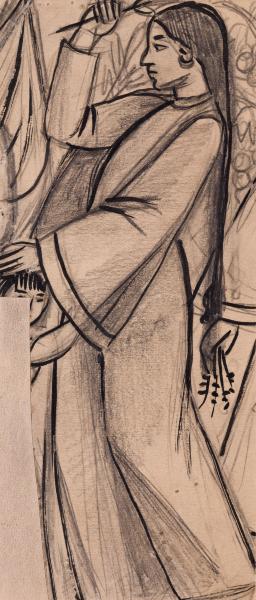 Fragment of a decorative multi-figure composition. The entire surface of the sheet is occupied by the figure of a woman of Eastern type, depicted in profile, walking to the left. The woman is dressed in a long, flowing robe with wide, billowing sleeves. A long braid hangs down her back to her knees, tied in a knot at the bottom. With her right arm bent at the elbow, she holds a branch with fruit above her head. Her left hand rests on the head of a boy, fragmentarily depicted at the bottom left.