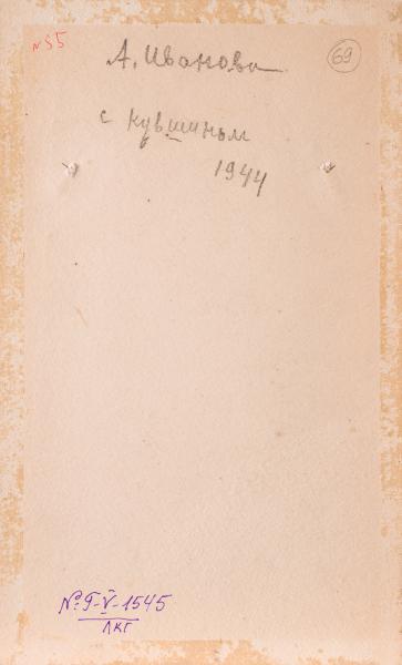 On the reverse, at the top centre, in pencil: "A. Ivanova / with a jug / 1944". At the top right, in red: "N 55"; on the right, in a circle, in pencil: "69". At the bottom left, in purple: "№ Г-V-1545/ ЛКГ".
