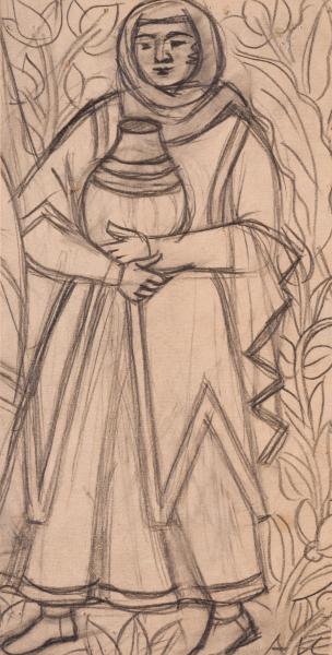 A full-length image of a woman in traditional Caucasian dress, facing forward with a large jug in her hands. The woman is wearing a long robe, a wide headscarf covering her neck and shoulders, and light shoes on her feet. In the background, to the left and right of the figure, there are schematic depictions of long, wavy stems with leaves and flower buds.