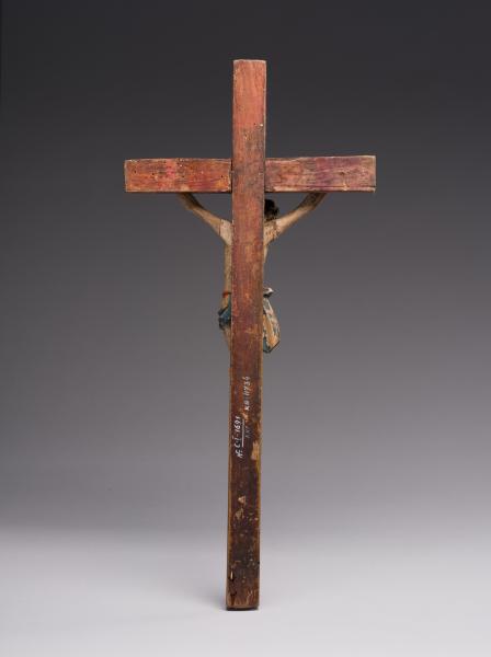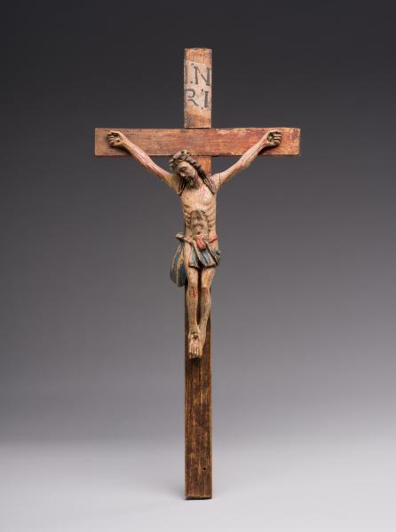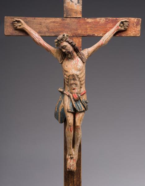 The work is part of an altar crucifixion. The figure of Christ is aimed at frontal viewing. Jesus is carved with his head tilted to the right shoulder. His arms are spread upward, his body is slumped, his feet are overlapping, nailed to the cross with a single nail. The elongated face is modelled conventionally, its expression sorrowful and concentrated. The hair and beard are indicated by carving, although without fine detailing. Christ's body is presented in a generalised manner: the muscles of the chest, abdomen, and ribs are only schematically indicated. A loincloth, tied with a cord, is depicted around the hips. The folds of the fabric are emphasised by deep carved lines, which give the drapery decorative expressiveness. The crucifixion is notable for its simplicity and conventionality of form, yet it carries a spiritual charge. It is not an academic skill that is evident in it, but the sincerity of the iconographic image, characteristic of folk sacred art.