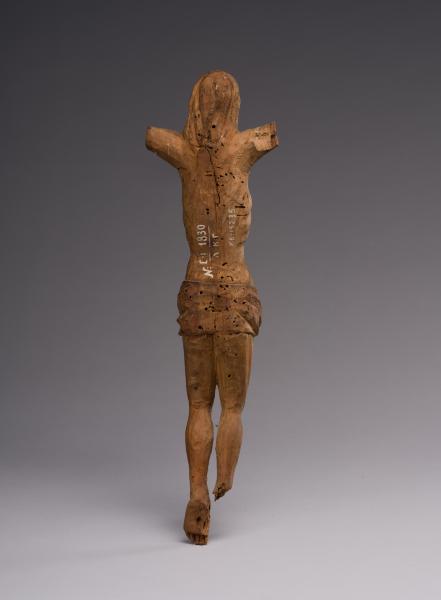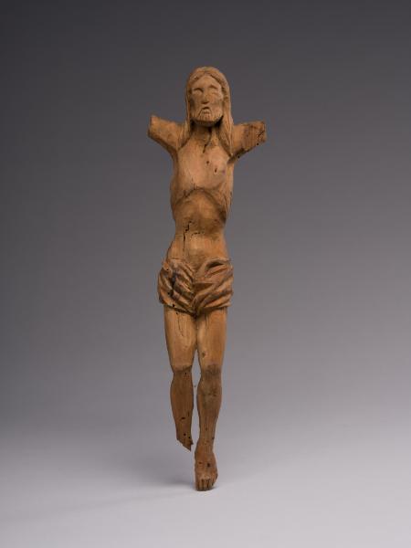 The sculptural image of the Crucifixion has suffered significant damage. The figure of Christ is elongated, with a clear aim towards frontal viewing. The elongated face has conventionally modelled features: a high forehead, outlined cheekbones, a straight nose, a short beard, an expressive mouth with downturned corners, and sunken eyes. Jesus' expression is one of sorrow and concentration. The body is presented conventionally, without fine details – the muscles of the abdomen, legs, and chest are schematically marked, which brings the work closer to the style of folk carving. He wears a loincloth on his hips. The folds of the fabric are highlighted by shallow carved lines, which give the loincloth a decorative expressiveness. The work is notable for its simplicity and conventionality, yet it carries a strong spiritual charge.