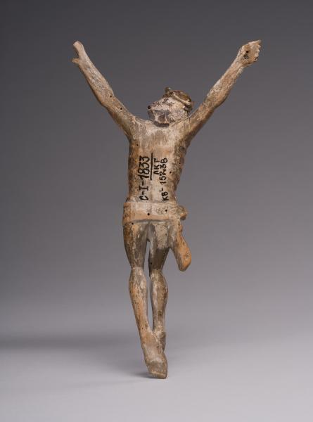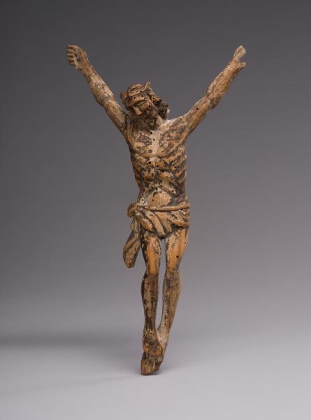 The crucifixion was part of a wooden cross. The figure is carved in a pose characteristic of Western iconography, following the traditional pattern with the head tilted to the right and specific body proportions. The master paid particular attention to the anatomical structure of the human figure. Attempts to emphasise the musculature and thinness of Christ's physique are evident. His hands, with closed palms, are raised and spread apart, his legs are crossed and nailed together with a single nail. Christ is depicted as dead, his head tilted towards his chest, his eyes closed. His hair falls in wavy, carved lines onto his shoulders. His head is adorned with a crown of thorns. Jesus' naked body is covered by a loincloth, rendered schematically with harsh lines that give the image a more decorative quality. Traces of polychromy can be seen on the body and the bandage on the hips. Through physicality, the author attempts to express the drama of the moment of execution. In the image of the Crucifixion, sacred symbolism is combined with the author's individual style, giving the work a special character, where the main goal is to convey the suffering and sacrifice of Christ through physicality and emotional expression.
