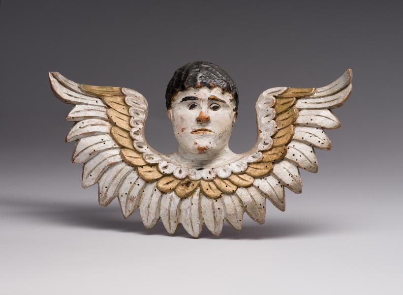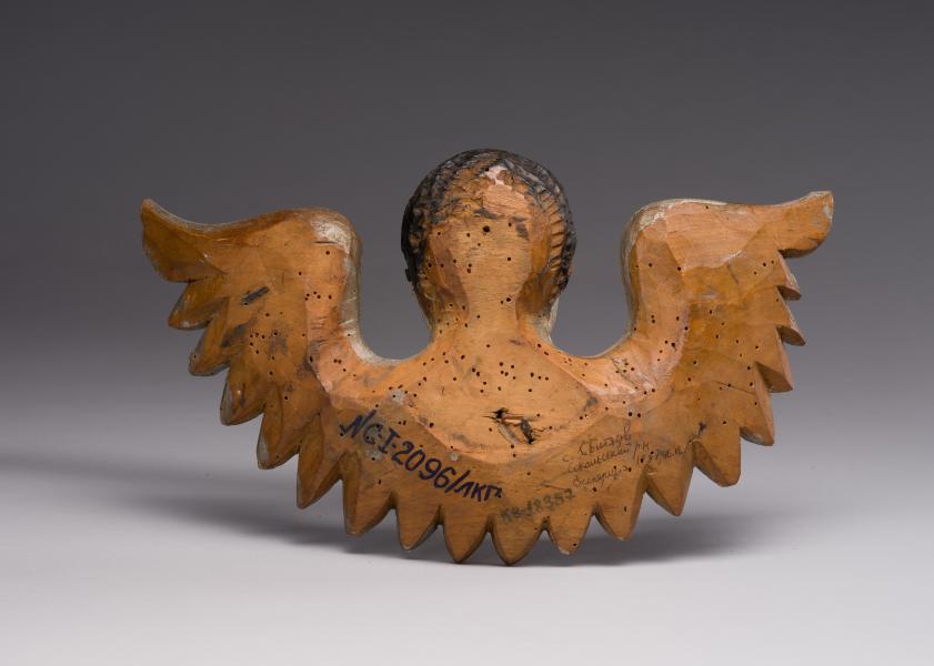 The image appears as a symbolic representation of a cherub, carved in a style typical of folk artists. The face is realistic and somewhat stern, devoid of lavish idealisation, yet possessing expressiveness. The light complexion of the face contrasts sharply with the dark hair, giving the image a dramatic tone. The small, somewhat disproportionate, deep-set eyes convey inner concentration, and the frozen expression of the lips with their downturned corners creates a sense of seriousness and imperturbability. The wings are full of decorative rhythm, carefully carved and traced with an emphasis on dark and light tones, which, to some extent, balance the severity of the face. The depiction does not so much emphasise angelic tenderness as personify a guarding and protective essence. The work reveals the artist's desire to combine realistic human features with the symbolism of heavenly forces, creating an archaic yet monumental interpretation of the cherub.
