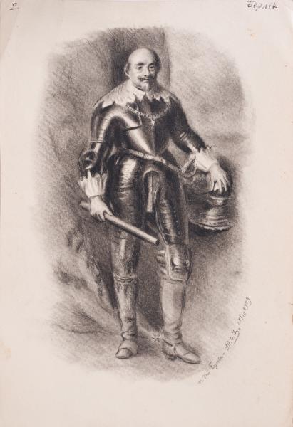 On a sheet of paper with some stylisation and generalisation done in charcoal, there is a copy of a work by Sir Anthony van Dyck (March 22, 1599–December 9, 1641), which could also be related to the fact that the author did not work with the original, but, for example, a graphic copy. The original painting by Anthony van Dyck, "Portrait of Johann VIII of Nassau-Siegen" (1627), from which Yulian Zaiats made a copy, is kept in the Liechtenstein National Museum. The work depicts a full-length figure of a middle-aged man against a drapery background, facing the viewer, with a short beard and moustache and pronounced hair loss on the scalp. In his right hand, the man holds a short staff, more reminiscent of a spotting scope, and his left hand rests on an object that is difficult to identify (in the original, it is a knight's helmet). The pose of the sitter is rather static, and the face is individual, but unlike the original, the expression is less emotional and more stern. The stylisation does not allow for the precise identification of the award on the man's torso, which in the original is the Order of the Golden Fleece (1624). The portrayed man's attire is appropriate for the period: knight's armour with embossed overlays, a collar and cuffs with lace, high boots, and spurs. As in the original, there is a certain theatricality in the composition, emphasised by the drapery on the left (in the original, the fabric is likely Damask) and the indistinct tonal gradations on the right side of the sheet (in the original, there are dynamic storm clouds with flashes of blue sky). The texture of the materials is rendered in a more stylised manner than in the original, but is noticeable in some places. The specific features of the copy indicate that it dates back to the early 20th century (in particular, the nature of the strokes and the approach to transforming the original). It should be emphasised that the execution of works of this type was an important stage in the study of the principles of composition and the practical experience of artists of previous eras in the field of both the reproduction of plastic anatomy and the development of psychological types, not only through facial expressions, but also through posture, staffage, and individual elements of the environment.