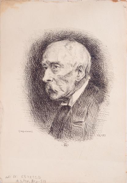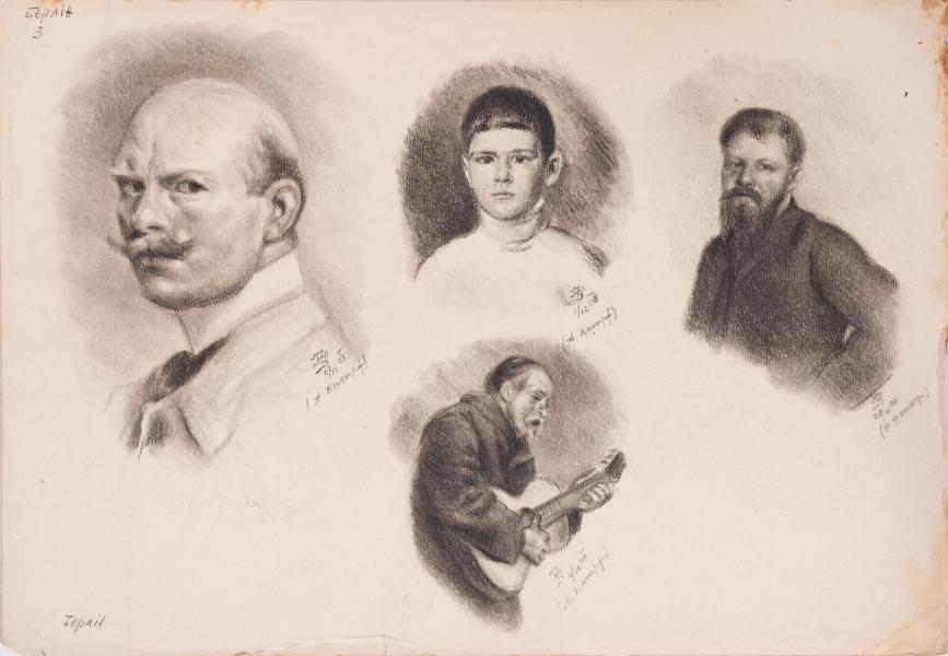 The front of the sheet features the author's variations on graphic works by German artist Arthur von Kampf, including a variation on one of his self-portraits, as well as types of characters commonly found in this artist's work. It should be noted that during the period when Yulian Zaiats was in Berlin, Arthur von Kampf's works were devoted to both social portraits and the recording of images of his contemporaries. Later, after Adolf Hitler came to power, Arthur von Kampf (the "von" in his surname appeared in 1921) joined the NSDAP (National Socialist German Workers' Party) and was personally included by A. Hitler on the Gottbegnadeten-Liste as one of the most outstanding artists of the Third Reich. It should be noted that from that time on, Arthur von Kampf's works were mostly devoted to promoting Nazi values and aesthetics, in particular the cultivation of images associated with racial purity (the so-called idea of Blut und Boden). However, at the time when Yulian Zaiats turned to studying the painting and graphic art of Arthur Kampf, the latter was an example of realistic research and development of psychological portraits of representatives of various social classes. Among Arthur von Kampf's works, as in the case of Yulian Zaiats, we find copies and replicas of outstanding artists of the past, in particular Anthony van Dyck (as in the work with inventory number Ф-З-Арх-ЛГМ-5/2). The first full-length portrait on a graphic sheet is a copy of Arthur von Kampf's self-portrait, which shows a middle-aged man with pronounced hair loss, a moustache characteristic of the fashion of the time (similar, for example, to the image of Paul von Hindenburg (1837–1934) and a sharp, focused gaze. Part of the upper clothing is stylised, but a characteristic stand-up collar is visible. Next to this portrait, in the centre of the sheet, we see a shoulder-length image of a boy with short dark hair, soft facial features, and in adolescent clothing typical of the time. Below the image of the boy is a portrait of the torso of an elderly man with a beard and moustache, probably a Jewish man (he is wearing a kippah), who is playing the guitar and, judging by his facial expression, singing. To the right of the central image of the boy is an image of part of the torso of a bearded man in city clothes. On the reverse side of the graphic sheet is a full-length figure of an elderly man with a moustache in urban attire of the time, shown almost in profile. It is worth noting here how carefully the artist strives to reproduce the portrait features of the man and emphasise his affinity with the aesthetics of European Baroque art. It should be noted that both this image and the image on the front of the sheet are presented as a medallion, where part of the background is marked with conventional hatching.
