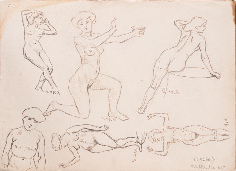 On the front side of the sheet, there are five portrait sketches of men of different ages, executed in the technique of academic drawing – pencil on paper (material with signs of oxidation). Compositionally, the works are situated separately from one another. All are portrayed from different angles – three-quarter, front, and profile. This approach to composing sketches is typical of academic drawings. Each portrait is accompanied by a caption indicating the author of the original (an approach characteristic of Yulian Zaiats), as well as the exact date, October 1911, which allows these sketches to be interpreted as part of a systematic educational practice within the art school. The faces of the subjects are unique, with individual characteristics such as facial expressions, eye movements, head shapes, and hairstyles. The author's attention to the psychological component is noticeable – some figures convey restraint and concentration, others – traits of age-old thoughtfulness. One of the characters is depicted wearing a hat, which gives the sketch a domestic feel. Light and shadow modelling, achieved through soft strokes with gradual tonal transitions, creates volume and depth. Particular attention is paid to modelling the face. All images exhibit harmonious tonal harmony, carefully proportioned elements, and anatomical accuracy. This sheet is an example of high-quality academic drawing from the early 20th century, demonstrating the influence of classical sources. The work demonstrates the author's comprehensive mastery of capturing portrait characteristics and modelling form with light. At the same time, the drawing is evidence of Yulian Zaiats' approach to the aesthetics of image presentation. On the reverse side of the sheet are later sketches of a female nude, dated 1919. Here we see a series of academic drawings of female nudes, presumably for educational purposes. Six figures are depicted in various angles, poses, and with varying degrees of detail, which is characteristic of the academic drawing practice of that period. The date markings suggest that the series is part of a daily process of studying the human figure, where the author recorded the model's poses over several sessions. In the centre is a figure with a bowl (?) in her left hand, leaning on her right knee, possibly executed as an element for a decorative composition or theatrical scene. All figures are female, nude, depicted in plastic dynamic poses, which indicates the high level of professional training of the author. Soft lines and clear contours reproduce the body's definition, facial expressions, muscle tension, and proportions. The compositional structure of the sheet suggests that the sketches served no other purpose than as careful exercises, yet they reveal a clear understanding of the laws of perspective and the construction of figures in space. Like other drawings from this period, this graphic sheet by Yulian Zaiats is a valuable source for studying the academic education system of the first third of the 20th century, as well as representing the practice of studying nude drawing, which was a mandatory part of an artist's education. At the same time, these sketches illustrate the sociocultural perceptions of the female body as an object of artistic study in academic discourse.