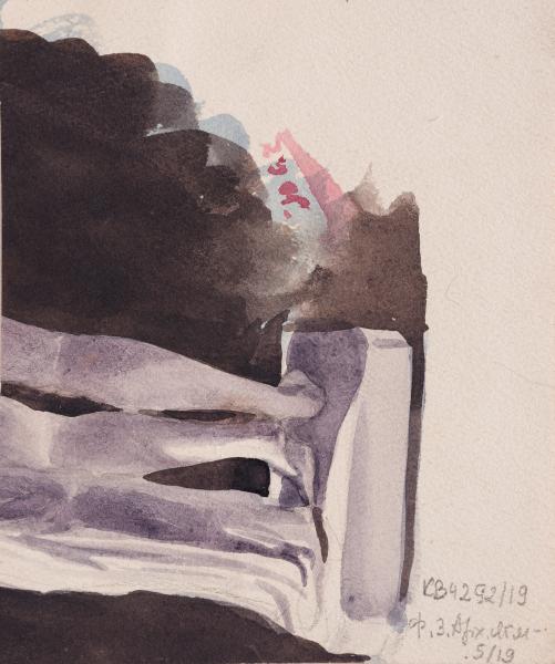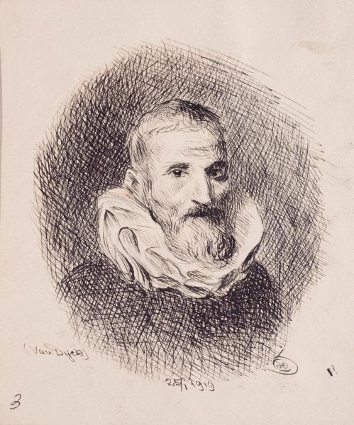 On the front of the sheet is a repetition of a famous painting, namely the portrait of the collector Cornelis van der Geest, created after the original by Anthony van Dyck. This time, the image is created not in pencil but in ink, which lends the portrait greater graphic expressiveness and depth of tone. The main compositional parameters are preserved: a three-quarter turn of the head, the rendering of the face, and the restrained silhouette of the clothes. The model is depicted in a calm pose, with a slight tilt of the head and a focused gaze looking at the viewer. The author of the copy accurately conveys the psychological depth of the image inherent in the Baroque original: dignity, inner peace, concentration – these features are enhanced by the contrast between the light planes of the face and the deep shadows of mascara. The work on the image is especially expressive, showing the desire to convey the age-old truth and intellectual weight of the portrait. Dark clothes and a puffy collar only schematically indicate the volume, without distracting attention from the face, the main emotional centre of the composition. On the reverse side of the sheet is a fragment of a watercolour study based on ancient sculpture. The lower part of a full-length male figure is depicted – only the legs, partially the hips, and the support under the left foot, which refers to famous sculptural examples, such as the Hercules of Farnesia. The watercolour is executed with attention to anatomical accuracy, the transfer of muscle volumes, and the plasticity of the pose. The soft yet controlled application of colour enables us to preserve the sculptural monumentality and, at the same time, convey bodily realism. This fragment continues the studio character of the sheet, indicating the artist's systematic work with examples of the European tradition, where classical antiquity and Flemish portraiture are equivalent sources of learning.