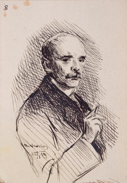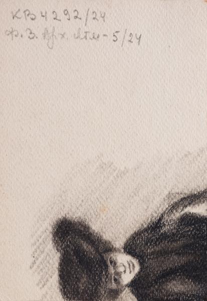 The graphic portrait is created using the technique of ink drawing with a pen, which is typical of academic drawing from the early twentieth century. The composition has a chamber-like, yet psychologically intense character: a middle-aged man with a high forehead, moustache, and deep gaze, facing the viewer in three-quarters, holds a cigarette in his right hand. The work is signed by the author. This is a copy of a work that has not yet been identified (the reading of the signature requires clarification), dated January 15, 1919. This gives the image not only historical but also documentary significance, indicating the possible educational or studio origin of the drawing. The drawing is executed with a confident hand, with a high degree of mastery of the hatching technique. The author uses cross-hatching both to model volume and to create a rhythmic background that enhances the facial expression. The face is painted with special attention to anatomical accuracy, while maintaining a slight conventionality, especially in the depiction of the nose, eyelids and forehead. The gaze of the portrait subject – focused, almost stern – creates an internal tension in the image, taking it beyond the limits of a simple sketch. The gesture of the hand deserves special attention: it is atypical for a classical portrait, almost stage-like, perhaps symbolic. Given the date, the drawing could have been created in the context of academic studies at a European art school, where great importance was attached to the ability to convey character through facial expressions, plasticity, and rhythm of line. The presence of a signature and date makes this drawing suitable for further research in the context of the history of art education, the author's personality, and potential models. The gesture of the hand with the cigarette can also have iconographic connotations. At the same time, a certain softness of the features and concentration of the gaze preserve the humanity of the image, avoiding cold detachment. This drawing is an example of a fine graphic work that embodies the skills of anatomical drawing, a deep understanding of the psychology of the image, and the ability to derive a type from an individual portrait. In combination with the previous drawing of a woman, this portrait can testify to the author's skill as a portraitist and an attentive observer of human faces and characters. On the reverse side is a fragment of a drawing of a woman wearing a hat with a wide brim.
