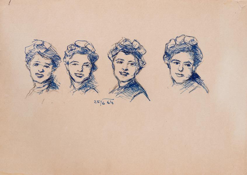 The sheet features a series of four female portraits drawn in blue ink on paper. All works are united by a common technique and manner of execution, which tends toward a laconic yet realistic depiction of the model. The bust portrait format allows the viewer to focus on the characters' faces, their facial expressions, and subtle emotional states, without overloading the composition with unnecessary details. The works do not contain backgrounds or decorative surroundings, as they are purposeful visual studies that explore individual features of appearance, the character of lines, and the rhythm of composition. Each image demonstrates careful attention to the structure of the face, its anatomical features, and the preservation of harmonious proportions. The line is confident, clear, but not rigid, and can modulate: in some areas, it becomes thinner, while in others, it is saturated to create depth or emphasis. The absence of colour is compensated for by the variety of ink densities, which creates precise boundaries between light and shadow. This achieves the effect of volume and presence of the model, despite the technical limitations of the means of expression. The women's faces are similar, perhaps conventional types, or attempts to capture a specific individuality, while leaving some room for interpretation. The clothing is depicted in a generalised manner, with only hints of a collar or shoulder line, which corresponds to the overall concept of the series as an exercise in portrait observation. It is particularly noteworthy that these works are no longer educational in nature. Created by an artist who was already mature, they are the result of independent research on the subject, where faces are studied as carriers of inner states. These are unique exercises in research, but not in the sense of technical training; rather, they are a form of professional, self-reflective, artistic dialogue. This practice is typical for experienced artists who use drawing as a tool for thinking, a plastic equivalent of internal observation. The laconic manner, the absence of decorative excess, the clarity and precision of the line, emotional restraint, and psychological expressiveness – all these form a coherent series that can be viewed as an autonomous plastic exercise in portrait modelling and a fragment of the search process within the author's creative methodology.