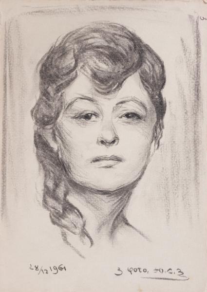 The sheet features a bust-length portrait of a young woman, executed in graphite pencil in a restrained, realistic manner characteristic of the author's mature phase of work. The work, dated 1961, is distinguished by its combination of academic precision and individual observation. The model's type is reminiscent of the cinema images of the 1960s: delicate features, a smoothly outlined oval face, and long, combed hair with strands. Visually reminiscent of Natalia Seleznova (1964) or the American actress Shirley Jones in her younger years. This is a light, "cinematic" type with a combination of freshness, delicacy, and inner peace. The drawing focuses on the face and shoulder line, which are outlined with a confident yet subtly modulated line. Soft strokes form a chiaroscuro modelling that allows for convincing plasticity without losing sophistication. The tonal transitions are executed with extreme care, on the verge of visibility, with clearly controlled saturation. The main focus is on the expression in her eyes and her slight smile, which give off a sense of inner light, intelligence, and openness. The drawing doesn't have a busy background: the space around the portrait is left blank, which draws attention to the face and keeps the viewer's gaze on the emotional centre of the composition. At the same time, the absence of a background enhances the effect of portrait "isolation," a characteristic of graphic studies, where the primary focus is not on context but on form and character. Despite the obvious similarity to the cinematic canon of female beauty of the 1960s, the author does not reduce the image to a glossy template. On the contrary, the drawing retains a sense of living presence, a holistic inner state, in which the psychological intention to convey not only the appearance but also the subtle mood of the moment is traced. The work demonstrates complete mastery of the academic school of drawing and, at the same time, attests to the personal intonation of a mature artist, attentive to nature but free in interpretation, capable of combining plastic clarity with the lyrical sound of the image.