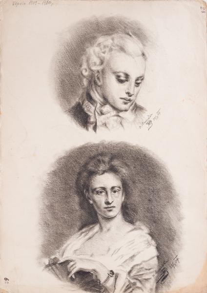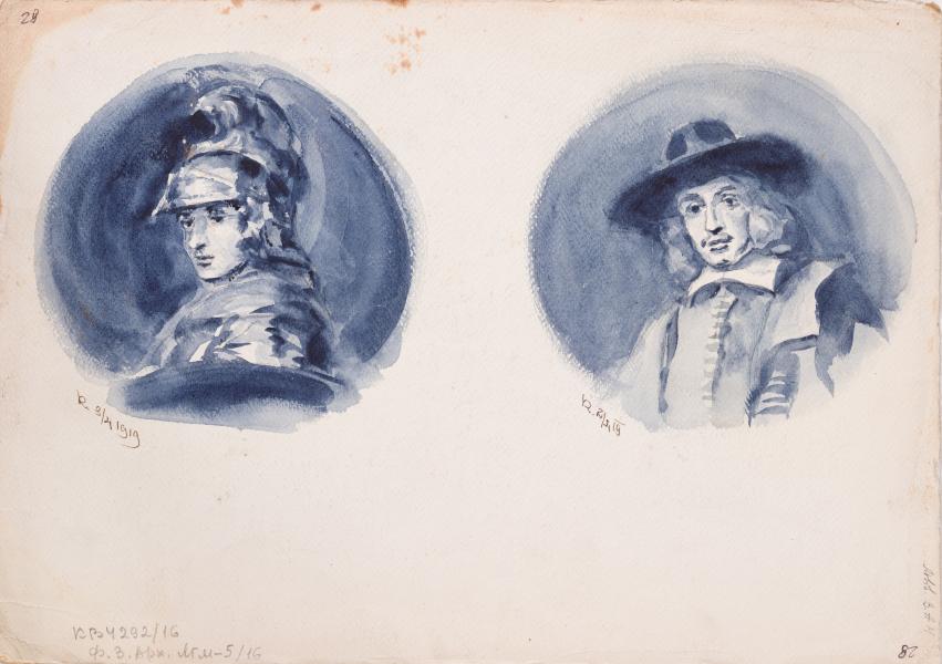 The front side of the sheet features two drawings based on the work of Jan Matejko: a portrait of the head of Stanisław Szczęsny Potocki, based on a fragment of his monumental painting Rejtan, or the Fall of Poland (Rejtan at the Sejm in 1773) (1866), and a female portrait, also reproduced from the original by the Polish artist. Both images were created in soft pencil, with an emphasis on studying the pictorial prototype through the graphic language of academic drawing. Stanisław Potocki's head is presented in a three-quarter turn with a slight downward tilt, which preserves the psychological tension characteristic of Jan Matejko's composition, although somewhat generalised. Despite the simplified interpretation of the details, the drawing captures key emotional traits, such as restraint, alienation, and demonstrative dignity, which, in the context of the original, acquire a political connotation. The image is based on a fragment of a painting that is conditional and not entirely historically accurate: Jan Matejko's depiction of Stanisław Potocki is more a generalised representation of the collaborative position of the Polish nobility during the partition of the Polish-Lithuanian Commonwealth than a life-size portrait. This gives the drawing a double meaning: both a study of Jan Matejko's style and an attempt to comprehend the visual code of a certain historical narrative. Next to it is a female portrait, also painted after Jan Matejko. It is distinguished by its expressive structure and restrained gradation of light and shade, which helps to emphasise the nobility of the features and inner concentration of the character. Both drawings demonstrate a careful study of Jan Matejko's signature style, characterised by meticulous elaboration of faces, typification, and subtle manipulation of light volume. On the back of the letter are two copies of Rembrandt van Rijn's watercolour paintings: "Athena Pallas" (1655) and "Portrait of Jan Six" (1654). Both images are distinguished by a gradation of tonal transitions achieved through transparent layering of paint with gradual complication of the shape. In the case of Athena, the allegorical solemnity of the image is preserved: a massive helmet and expressive lighting of the face – all this is reproduced in the copy, albeit adapted to the limitations of the watercolour technique. The female figure is calmly balanced, surrounded by a soft penumbra that creates the effect of depth. The portrait of the Dutch statesman and art lover Jan Six is a more intimate, chamber image. The watercolour copy preserves the main elements of the Rembrandt style: soft light modelling of facial features, expressive gaze, and calm confidence in posture. The copy artist focused not only on the external similarity but also on conveying the model's inner state, which is especially important in Rembrandt's studios. Both works on the reverse side demonstrate an interest in psychological depth, light and shadow saturation, and a harmonious combination of formal and emotional elements in the image, features that were crucial to Dutch Baroque art. In general, the works demonstrate a systematic approach to studying stylistic differences in European painting of the seventeenth and nineteenth centuries through academic graphic practice.