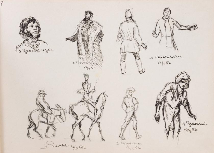 The sheet presents a group of sketches made with analytical interest in characters from the works of European and Soviet artists of different eras. It is a kind of visual study of characters, in which the author seeks not only to capture the external features of faces, but also to convey the psychological tension, grotesque or dramatic expressiveness inherent in the sources. Among the identified images are Don Quixote and Sancho Panza as interpreted by Honoré Daumier with the master's characteristic mixture of satire, humanism, and tragic irony. Both characters are read not only as figures from a literary work, but also as generalised images of people on the verge of the comic, tragic, and heroic. Next are the characters of Paul Gavarni (the first in the front row on the left and the last on the right in the second row). The line here is lighter, poster-like, with elements of graphic stylisation close to the illustrative tradition. The image is conveyed with sympathy, some detached irony, and attention to detail, particularly in the work on the plasticity of the man's body, the curve of his neck, and the position of his shoulders. The third block consists of fragments from compositions of the Soviet period, in particular, a portrait of a red-bearded (in the original) man in a fur coat from Borys Johanson's famous painting "Soviet Court". The author interprets the image not as part of a genre scene, but as a self-sufficient character. The figure, which likely belongs to Oleksandr Harasymov's work, is drawn in the same manner. Perhaps these are types of peasants or collective farmers, characterised by a monumental calmness and a rigid, stoic build. The second-to-last figure is a portrait of an unknown character, probably from the works of an artist of the late 19th to early 20th centuries (the name is unclear, possibly "K(P)...yuka"). The portrait is intimate in nature, possibly with elements of realism. Light hatching and sparse lines only allow the anatomy of the face to be outlined, but the gaze retains its individuality. The manner of drawing is generally clear and confident, with slight variations in line depending on the source. In the case of O. Domier and P. Gavarni, the style is slightly lighter and more graphically decorative, whereas in the case of Soviet images, it is heavier, with an attempt to convey volume and tonal mass. It remains clear that these drawings are not exercises in copying, but rather reflections on the language of the image in different cultural and historical contexts. The author works consciously, using these types to study the characteristics of the visual code from satirical to monumental, from romantic to everyday. The captions under some of the images testify to the systematic nature of the work (dates: 1962, identified names), which allows us to consider the letter as part of a broader cycle of graphic explorations by the artist in his mature years, with an emphasis on the study and reconstruction of artistic languages of different eras.