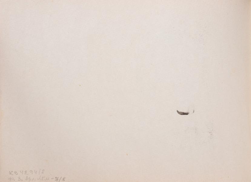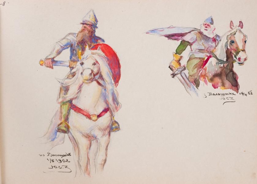 The sheet features two figures of knights-bogatyrs, executed in watercolour using a limited, balanced palette with separate colour-saturated sections of red, yellow, and brown. The work belongs to the period of the author's mature experience (1960s), when visual studies of classical models were combined with elements of interpretation and compositional variation. The first figure is a fairly accurate copy of the left character from Viktor Vasnietsov's famous work "Bogatyrs" (1898), Dobrynia Mykytych. The knight is depicted on horseback, in a characteristic pose, firmly seated, with a straight posture and a sideways glance. With his right hand, the man holds the hilt of his sword, and with his left, a bright shield. Characteristic elements of armour are reproduced, including a long chain mail hood, a cone-shaped helmet, and a red shield on the left hand. The watercolour technique allows the artist to convey the volume and overall atmosphere of the image without excessive detail, while maintaining the monumental calmness and balance of the figure. The colour scheme is balanced, which enhances the impression of epic restraint. Next to him is another figure of a bogatyr, executed in the same style, but without direct identification with a specific source. Most likely, this is the author's fantasy reconstruction of the image in the spirit of romanticised heroic painting of the second half of the 19th – early 20th centuries. The figure is depicted from the hips up, with powerful shoulders, a flowing cape, a helmet, and a massive fantasy sword, the shape of which goes beyond historical accuracy. Unlike Dobrynia, this figure is less recognisable but no less expressive: his gaze is directed to the side, his face is modelled energetically, with light brushstrokes that convey the features of a strong-willed, focused character. The placement of the figures on the sheet is not accidental: the author deliberately contrasts the canonical image, fixed in visual memory (Dobrynia Mykytych), with an experimental variation of the type as an attempt to reinterpret the heroic image in his own manner. This juxtaposition indicates not just a copying approach, but a desire to enter into the structure of the classical image, to understand its internal rhythm, compositional principles, and psychological load, and then to create a new one based on the same visual and emotional patterns. Thus, this watercolour work can be an example of the research practice of an artist in his mature period, combining a deep knowledge of classical painting, a respectful attitude toward sources, and an appeal to the imagery of the epic tradition.
