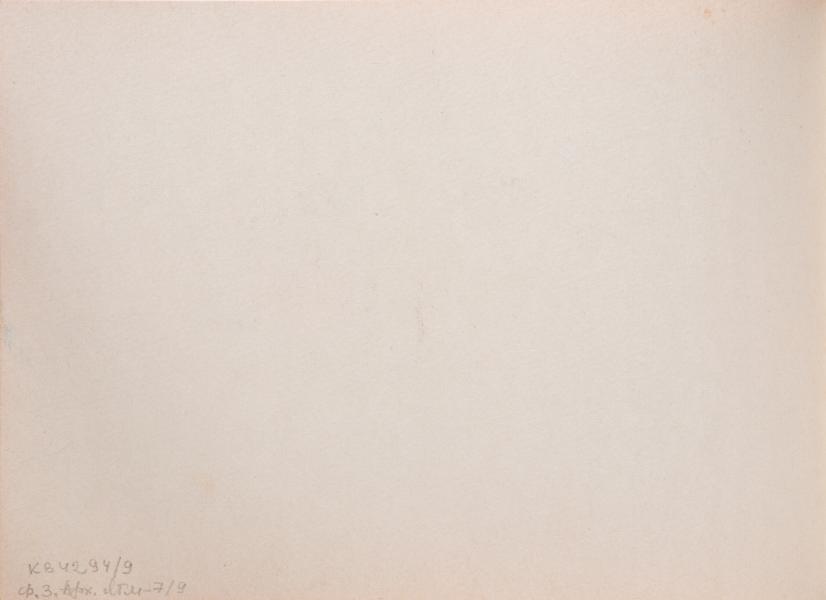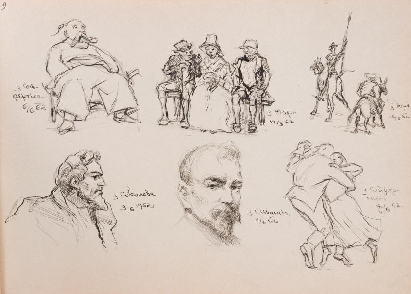 One sheet contains a series of genre and portrait sketches executed in ink and pencil, which are copies or interpretations of samples from the works of various 19th–and 20th–century artists. All compositions are accompanied by the author's signature, indicating the source and the exact date of execution (May–June 1962), which provides grounds to interpret this sheet as evidence of the artist's systematic copying and stylistic-analytical practice during the period of his mature, independent formation of his visual language. From Leonid Soifertis (June 6, 1962): depicts a caricatured Cossack sitting in a somewhat grotesque but distinctly plastic pose. The work is notable for its linear expression, characteristic of L. Soifertis, the wit of the image, and the generalised interpretation of form. The author emphasises the pose and gesture, conveying the character's personality with a slight caricature-like deformation. From Huart (May 12, 1962): a genre scene with three figures – two men sitting on a bench next to a woman in a hat. The composition is restrained, typical of French graphics from the late 19th to the early 20th centuries. The author reproduces not only the figurative structure, but also the atmosphere of an intimate interpersonal dialogue, where visual gestures fix characteristic social roles. From Gustave Doré (May 12, 1962): images of Don Quixote and Sancho Panza are presented – two figures in characteristic motion. The emotional contrast between the elongated, schematically heroised figure of the knight and the down-to-earth, dense posture of the squire is preserved. There is a noticeable attention to the rhythm of the line and the dynamics of the composition, which refers to the illustrative tradition. From Sokolov (9 June 1962): a full-length portrait of a bearded man in profile, with a lush hairstyle. The work emphasises the aesthetics of volume, especially in the area of the hair and beard. Soft hatching and thoughtful lighting testify to a careful study of facial plasticity and silhouette expressiveness. From Serhii Ivanov (8 June 1962): a three-quarter portrait of a man with a goatee. Here, the author employs a classic portrait composition, featuring a slightly turned face. There is a noticeable attempt to convey the psychological state of the model through the expression of the eyes, while maintaining academic accuracy of form. From Soifertis (8 June 1962): a scene of a couple dancing – a man and a woman in motion. Characterised by lightness and grace, this composition approaches theatrical plasticity. The author clearly conveys rhythm, gesture, and the interaction of bodies, emphasising the dynamics with linear refinement. All six groups of images demonstrate both a copying and an interpretative approach: the author not only carefully reproduces the main features of the sources but also undertakes a visual analysis of the manner and style of the selected artists. The thematic diversity – from satirical illustrations to academic portraits – testifies to the multifaceted nature of the artist's interests. The sheet can be viewed as a form of educational and methodological work by a mature author who uses reproductions or originals as a source of stylistic exercises for the development of his own imaginative thinking.