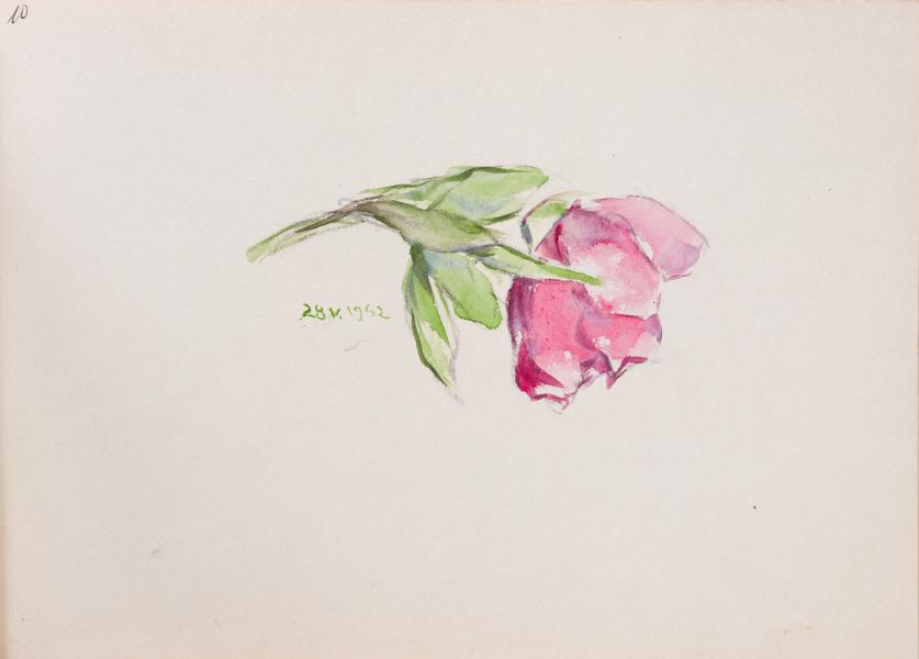 The watercolour composition depicts a stylised rose, executed in a restrained manner, reminiscent of decorative sketches or vignette-like graphics. The work is distinguished by the coherence of its silhouette and the soft plasticity of its lines, with minimal detail and no excessive modelling of volume or botanical accuracy. The main element of the composition is an open rosebud, depicted in a simple yet specific angle, where several petals are delicately outlined with semi-transparent strokes, with smooth transitions between pink and crimson shades. The absence of clear contours and the free use of colour enhance the effect of lightness and ease. The stem and leaves are presented in a generalised manner: a thin, slightly curved line of the stem maintains the compositional balance, and a few sketchy strokes of greenery only indicate the framing of the shape. The space of the sheet is not filled – a significant part of the background remains blank, which gives the image airiness and a sense of compositional openness characteristic of sketch works. The watercolour can be interpreted as an element of preliminary sketch research, possibly intended for use in decorative design, a book, or applied graphics. The style is consistent with the aesthetics of vignettes, title compositions, or small ornamentation, where the main focus is not on botanical accuracy, but on decorative conciseness, emotional tone, and graphic coherence.