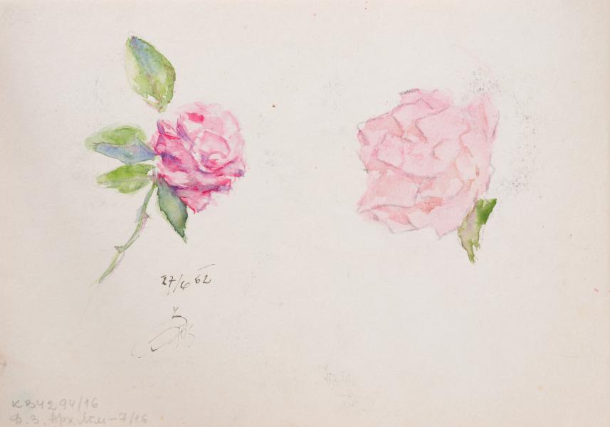 The watercolour depicting a cut rose in a horizontal position is an example of a stylised botanical composition, executed in a format similar to a graphic sketch or sketch by Y. Zaiats for a decorative vignette. The image of the rose is positioned on the surface of the sheet so that the flower lies parallel to the horizontal plane, creating a calm and balanced composition. The stem is thin, slightly curved, and the bud is fully open, yet not overloaded with detail: the shape of the petals is conveyed by light, almost transparent strokes, creating a sense of lightness and ephemerality in the image. The colour palette is muted and delicate, with an emphasis on warm pink tones characteristic of classic decorative watercolour exercises from the turn of the 19th and 20th centuries. The style of the drawing leans towards a decorative and graphic approach; it may have been created with the intention of further use as an element of ornamentation, a vignette, or an illustrative insert in the design of the text. The composition exhibits a sense of precision in the lines and a harmonious blend of flatness and spatial depth, indicating good training in drawing from life and careful observation of natural forms. At the same time, a certain conventionality of presentation, conscious stylisation, and a rejection of excessive realism indicate the author's reinterpretation of nature in the context of a decorative image. Interestingly, on the reverse side of the sheet, there are two more images of roses, probably also of a sketch nature. One of them is much more detailed: the petals have a distinct volume, the plant's structure is more accurately conveyed, and the play of light on the surface is more carefully modelled. The other flower is just a sketch, barely outlined and with a few light shadows, indicating the initial stage of working on the form. This suggests that we are looking not only at a finished decorative work, but also at a fragment of the entire process of artistic observation and study of plant forms, which involves successive stages: from a passing visual impression to a detailed study and reflection in the realm of decorative thinking. Such exercises were typical for artists who worked in the fields of book graphics, decorative album design, textile samples, or artistic modelling. The work shows the skill of a hand accustomed to working with live nature, but not for its accurate reproduction, but as a starting point for its own stylistic interpretation. It can be assumed that this watercolour was created as part of a broader study of the image of a flower as an element of symbolism, ornamentation, or visual accent in a book or decorative composition.