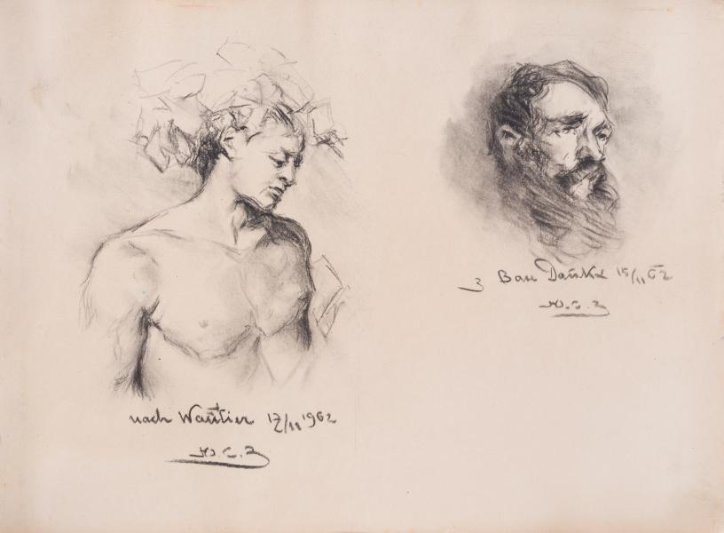 Among Yulian Zaiats' drawings created in 1962, two works are noteworthy, representing the author's interpretation of classical imagery characteristic of European painting from the 17th to the 19th centuries. Both images are copies and partly free variations based on the works of old masters. This is not only about practising technique, but also about attempting to gain a deeper understanding of the plastic, thematic, and psychological aspects of the classical image. In these drawings, Zaiats acts not only as an attentive copyist but also as a researcher who seeks inspiration for his own artistic thinking in the legacy of the old masters. The first drawing is a bust portrait of a young man with a bare torso, leaning in a thoughtful, slightly melancholic pose. His head is crowned with a wreath of grape leaves, hinting at the mythological or allegorical nature of the image. Perhaps this is a participant in a bacchanalia or even Bacchus himself in a moment of intimate reflection. This image is profoundly different from the theatrical bacchanalian scenes dominated by expression, chaos, and movement. On the contrary, we see a moment of concentrated silence, as if after a noisy celebration or before its beginning. Zaiats models the forms of the face and body with particular care, paying attention to the smooth transitions of shadows and lines, as well as the play of light on the collarbone, neck, and chest. The mixture of softness and graphic rigour gives the figure not only a physical but also a psycho-emotional presence. This is not just a training copy, but rather an interpretation of an image that conveys a sense of longing for the ideal, for a lost myth, or the profound essence of human nature. The second drawing, a three-quarter view of a bearded man's head, was probably based on one of Anthony van Dyck's portraits, although the exact source has not been established. However, the very choice of van Dyck as the basis for the drawing is telling, as he is a master of aristocratic portraiture, restrained nobility, and deep inner characterisation of the image. Zaiats, while preserving the general stylistic features of the original, does not copy it literally, but creates a self-sufficient graphic image in which considerable attention is paid to the rhythm of the lines, the structure of the beard, and the deep gaze. The visual mass of the beard and hair is balanced by soft chiaroscuro on the forehead and cheek. There is no excessive decorativeness in the image; on the contrary, restraint and plastic clarity create an aura of psychological depth. The slightly raised head and inward gaze lend the portrait an ascetic dignity reminiscent of Christian or Stoic ideals of masculinity. Both works are evidence of a special stage in Yulian Zaiats' career, as 1962 was a time when the artist had already established himself as a master, capable of critically rethinking traditions and weaving them into his own creative strategy. Therefore, these are not just exercises in craftsmanship, but rather intellectual dialogues with the past, a search for deeper layers of imagery that could nourish his further artistic work. Presumably, these images, physically expressive yet internally focused, served as a kind of matrix or reflective points through which the author contemplated human nature, dignity, strength, and fragility. In this context, the drawings of 1962 take on greater significance, allowing for a better understanding of the artist and the formation of his own artistic language.