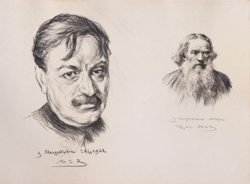 The drawings of two male portraits are distinguished by clearly defined types, reflecting not only the appearance of the persons depicted, but also the cultural and psychological subtext of each image. Both are executed with a deep understanding of facial anatomy and character traits, with Yulian Zaiats' characteristic attention to form, constructive modelling of the head, and the conveyance of individual features. The portrait on the left is a drawing copy of Vasyl Mieshkov's painting depicting Viacheslav Menzhynskyi. The figure is almost facing forward, with a focused gaze directed at the viewer. The face is elongated but sickly, with a defined nose, an indistinct jawline, and a neat moustache, complementing the image of a revolutionary intellectual who, after Feliks Dzerzhynskyi, headed the Joint State Political Directorate. His hair is untamed, his hairstyle chaotic and unkempt, which, together with his collar, creates an impression of dissonance. The author of the drawing carefully conveys the nuances of light and shadow, maintaining compositional restraint and accuracy. The portrait on the right is a drawing interpretation of a probable photograph of Leo Tolstoy in his later years. It is a frontal portrait, almost facing forward, which allows for a more accurate rendering of the face's plasticity and the characteristic texture of the hair and beard. Leo Tolstoy is depicted in simple clothes, with an unadorned shirt collar. His hair is slightly dishevelled, and his bushy beard, which occupies a significant part of the portrait, is modelled with confident lines and soft shadows. His expression is serious, full of calm dignity, inner depth, and almost detachment. This portrait does not so much capture resemblance as it attempts to capture the writer's inner world. Both images are united by their full-length format, but contrast in character: the conventional “formality” of V. Menzhynskyi is juxtaposed with the austere asceticism of L. Tolstoy. Compositionally, the figures are positioned so that they do not interact, each enclosed in its own inner field. This gives the work a tense balance, like a meeting of two types of thinking: the politician-ideologist and the writer-philosopher. These drawings were probably created by studying different approaches to portraiture in painting and photography, or became the basis for the author's reinterpretation of the cultural symbols embodied in the images of both figures.