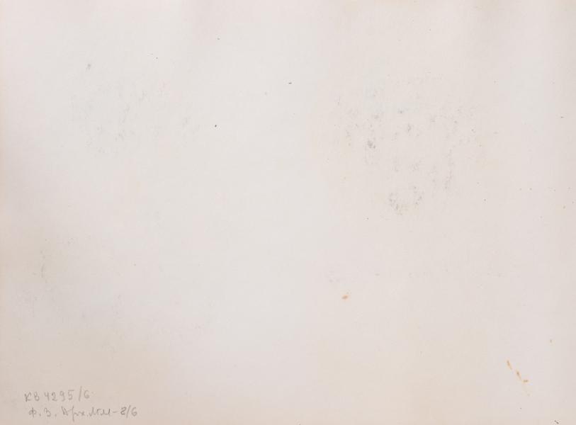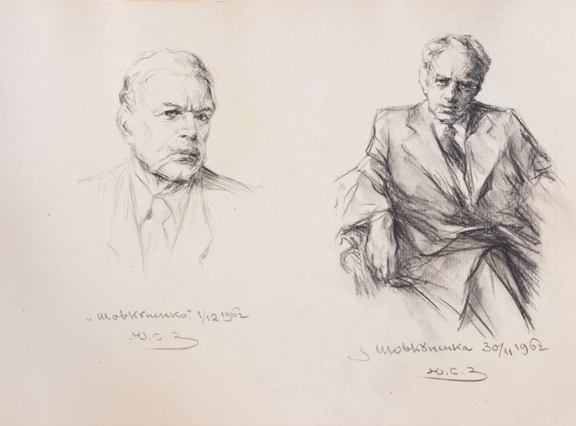 The drawn copies of two male portraits demonstrate a deep interest in the individuality of the figures depicted. The emphasis is not only on external features, but also on the inner state, creative tension, and cultural context of each image. In both cases, we are discussing images of mature intellectuals, and the shoulder-length portrait format enables us to focus on the character of the faces. On the left is a drawing copy of a photographic portrait of the artist Oleksii Shovkunenko in his mature years. His gaze is directed at the viewer, giving the image a thoughtful and detached tranquillity. His face is massive, with deep nasolabial folds, a broad forehead, and an attentive, almost investigative gaze. His hair is grey, slicked back, and his hairstyle is laconic, which reinforces the impression of concentration and intellectual severity. The lines of the drawing are confident, plastically expressive, with clearly defined shadows in the area of the eyes, nose, and chin. His attire – a light jacket with a soft collar – is outlined with just a few strokes, so as not to distract attention from the main focus: the artist's concentrated face. On the right is a drawing interpretation of a painted portrait, probably of the writer Yurii Yanovskyi, created by Oleksii Shovkunenko himself. Compositionally, the head is placed facing forward, the face slightly tilted. Y. Yanovskyi's (?) face is elongated, with soft features, somewhat melancholic, with expressive eyes and a deep gaze. His hair is grey, slightly wavy, and combed back. The author of the drawing carefully conveys the texture of the face, uses tonal transitions to model the cheeks, forehead, and chin, and adds light accents in the area of the lips and eyes, giving the image a penetrating look. Both portraits form a harmonious duet, a dialogue between two creative personalities: an artist and a writer, masters of the brush and the word. Juxtaposing them on the same sheet is not only a compositional technique, but also a metaphor for the interdisciplinary interpenetration of the arts. The drawings reveal sensitivity to nature, the ability to capture the psychological atmosphere and cultural depth of each image, as well as masterful use of line and chiaroscuro within the framework of academic drawing.
