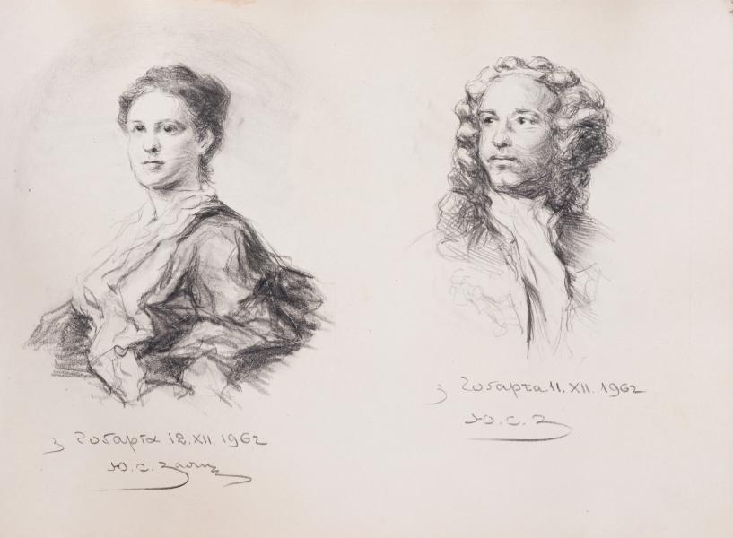 Two drawings by Yulian Zaiats, based on famous portraits by William Hogarth, represent a skilful combination of attention to 18th-century historical painting and a subtle adaptation of the Baroque portrait style to graphic reproduction. Both images are three-quarter-length portraits, but each has its own unique psychological mood, which Y. Zaiats carefully preserved and interpreted. Hogarth's portrait of Mrs Salter (1744) is distinguished by a particular softness in both the treatment of the figure and the expression on her face. The young woman, turning slightly, looks to the side, her gaze a combination of confidence and seriousness. Her hair is styled in a specific way, quite loosely, and her draped dress creates an atmosphere of elegant sophistication of the mid-18th century. In his drawing copy, Y. Zaiats accurately conveys the proportions, gently models the face, and carefully works out the figure. The artist pays special attention to chiaroscuro, using it to enhance the feeling of volume and delicacy of the skin. The portrait of actor James Quin (1739) has a completely different energy. W. Hogarth depicted the famous British performer of tragic roles, including Othello and Macbeth, turning to the left, with his gaze directed to the side, as if he were thoughtfully withdrawn. Heavy facial features, an indistinct neck, and a rich wig give the image a monumental quality. In Y. Zaiats' graphic interpretation, this monumentality is emphasised by dense strokes. Placed side by side, these two works form a striking counterpoint: the feminine portrait lightness of Mrs Salter is contrasted with the serious, almost heroic restraint of James Quin. This combination highlights not only the Zaiats' ability as a copyist-researcher to preserve the original composition and character, while simultaneously revealing his own understanding of the psychological depth and historical context of the images.