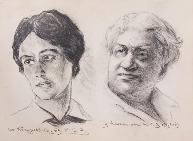 In the centre, beneath the images: "From Kustodiiev"; "18/2 63"; Yulian Zaiats' signature; "From Laktionov"; Yulian Zaiats' signature; "18/2 1963".